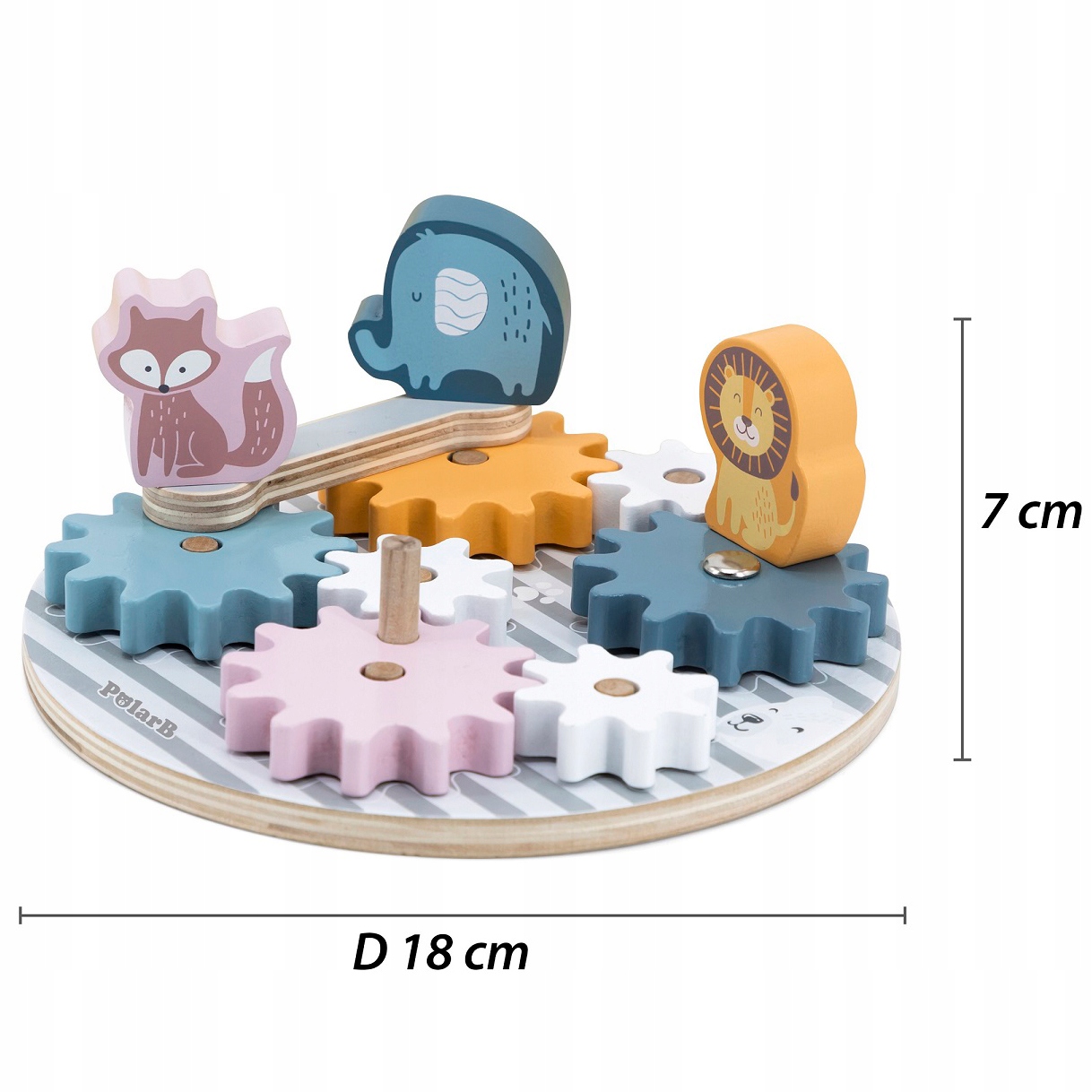 Деревянные шестеренки с животными от известного бренда Viga — идеальная игрушка для детей, которые хотят познавать окружающий мир. Точно выполненные элементы позволят вам прикоснуться к каждой детали фигурок животных — главных героев серии PolarB. Игрушка поможет вам изучить основные законы физики – как работает шестерня. При вращении первого колеса дальнейшие элементы приходят в движение и мощность передается на последующие шестерни.