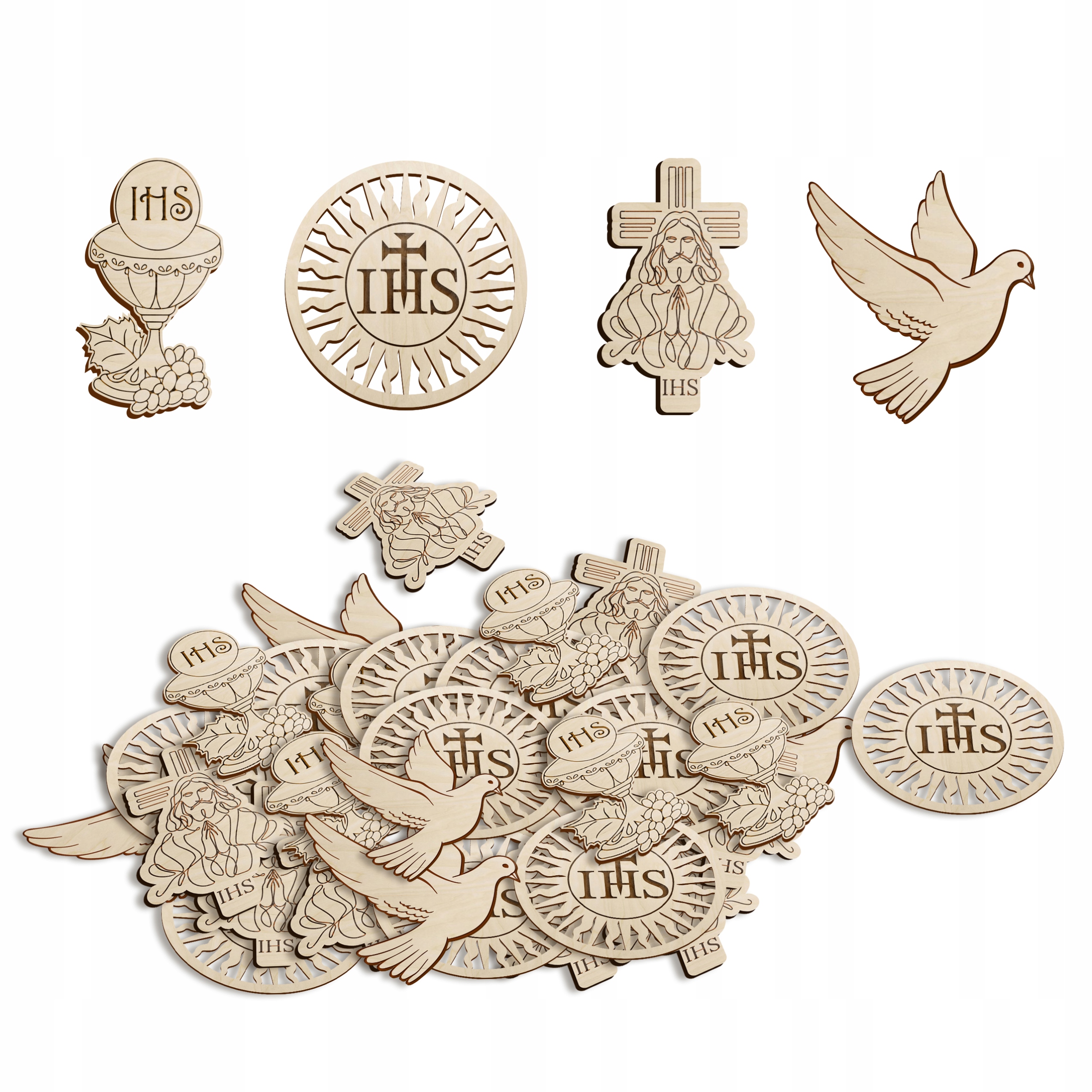 Деревянные отходы, хозяин, крест, голубь, являются декоративными литургическими элементами, сделанными из твердой фанеры березы и с эстетической гравировкой . они идеально подходят для украшения стола во время церемонии первого святого причастия, виньетки, украшений тортов, для приглашений, альбомов, или других украшений, добавляя элегантность и подчеркивая религиозную природу этого события >