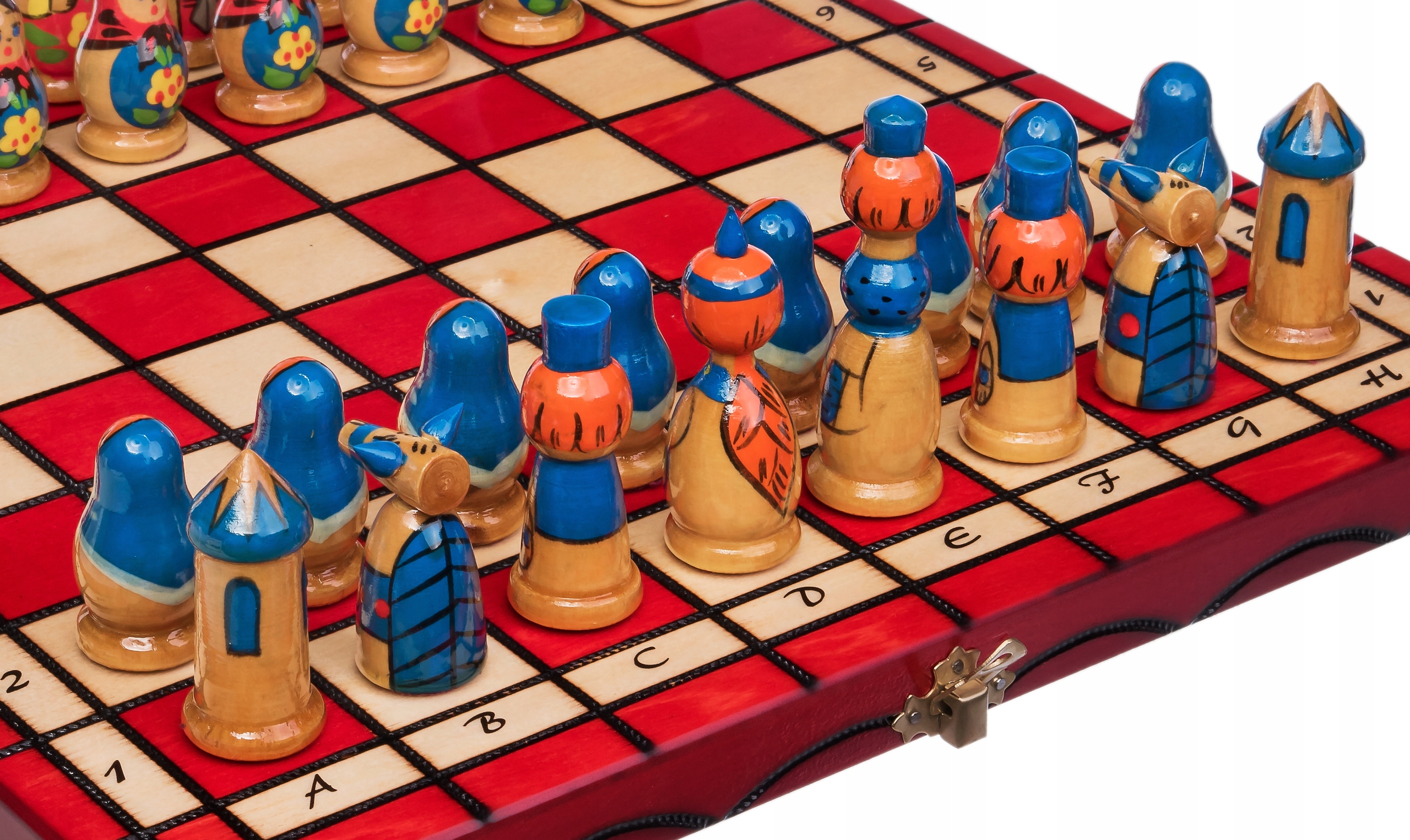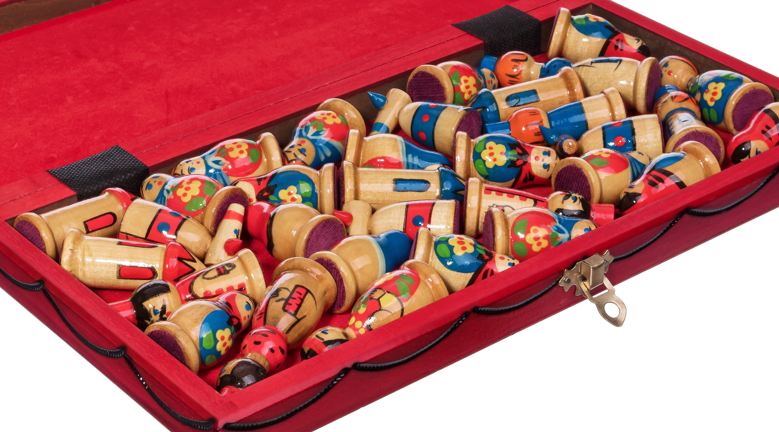Шахматные фигуры изготовлены из дерева и расписаны вручную мотивами, напоминающими русские матрешки.