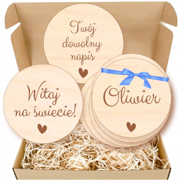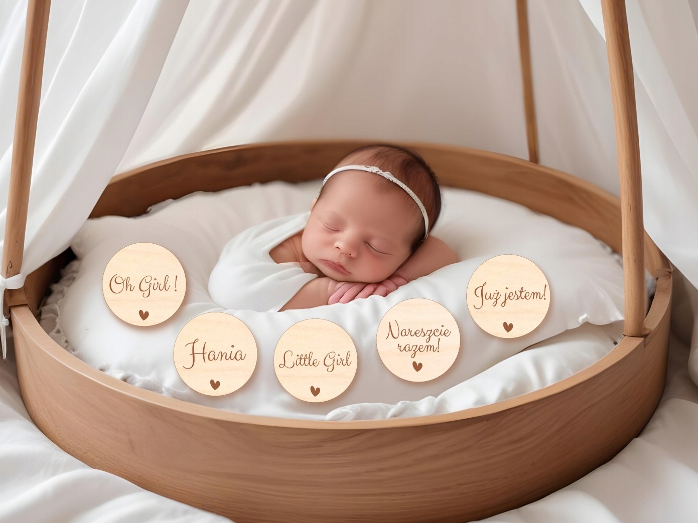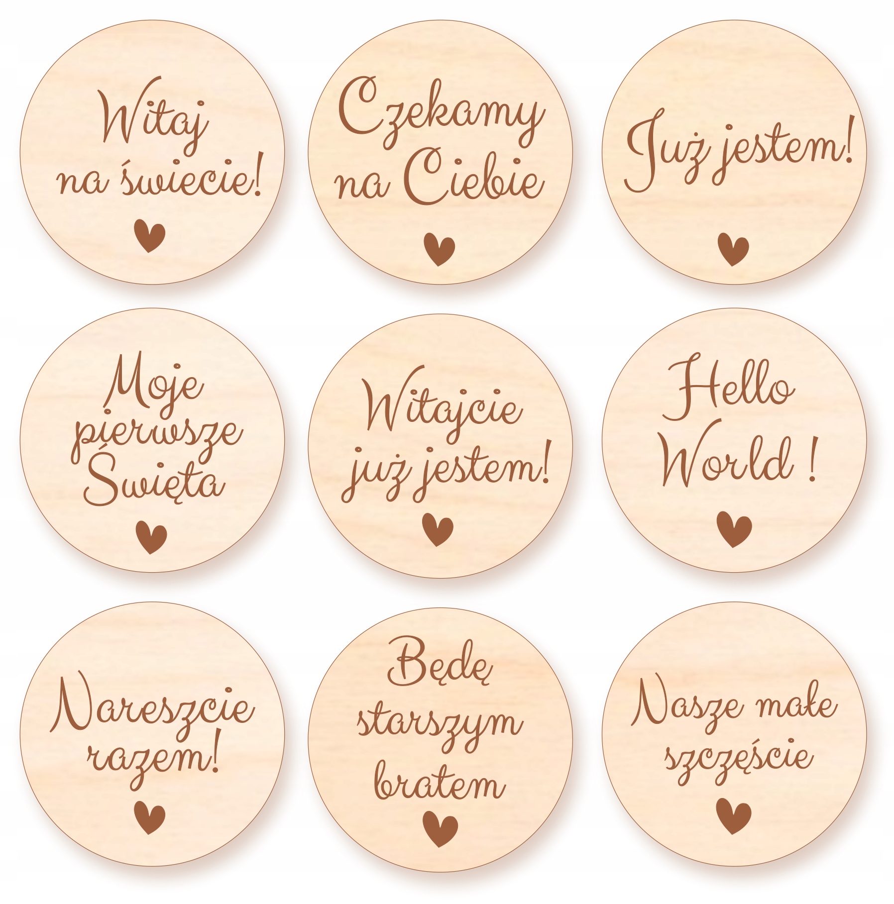 - 2 дополнительные таблички с надписью на выбор, например: «Я здесь!», «Мы ждем тебя», «Наконец-то вместе!» , "Привет я здесь!" , «О, девочка!» , "О, парень!" , «Маленький мальчик», «Маленькая девочка», «Маленький мальчик», «Девочка» В качестве дополнительного имени вы также можете выбрать, например, другую табличку в случае братьев и сестер/близнецов.