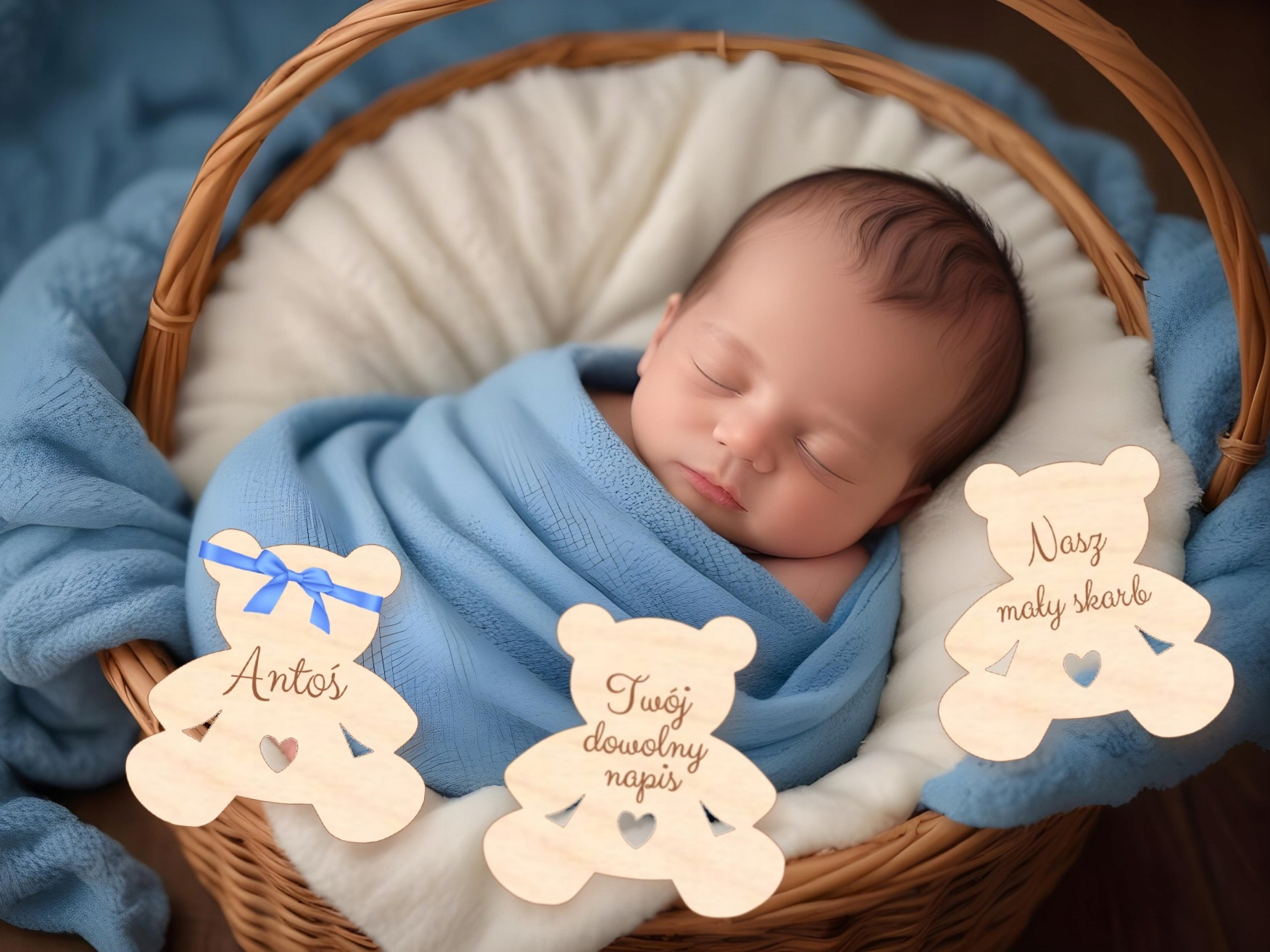 - 2 дополнительные таблички с надписью на выбор, например: «Я здесь!», «Мы ждем тебя», «Наконец-то вместе!» , «Привет, я здесь!» , «О, девочка!» , «О боже!» , «Маленький мальчик», «Маленькая девочка», «Маленький мальчик», «Девочка» Вы также можете выбрать дополнительное имя, например, другую табличку в случае братьев и сестер/близнецов