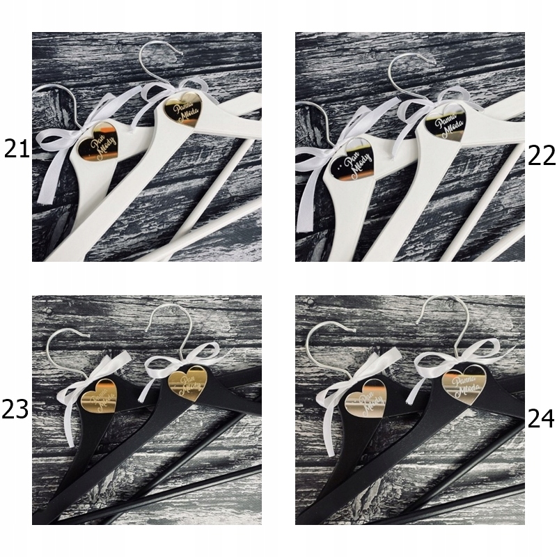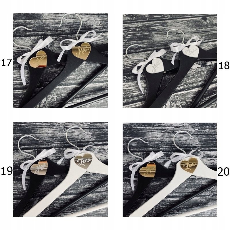 Деревянные свадебные вешалки, которые прекрасно показывают свадебное платье и костюм. Они станут отличным дополнением к свадебной сессии и дадут очарование подготовки к свадьбе. Сделано из дерева, окрашенного в черно -белое с белыми луками, которые позволили бы вам подчеркнуть символ любви. Названия изготовлены из серебра, зеркального плексигласа 2 мм или 3 мм