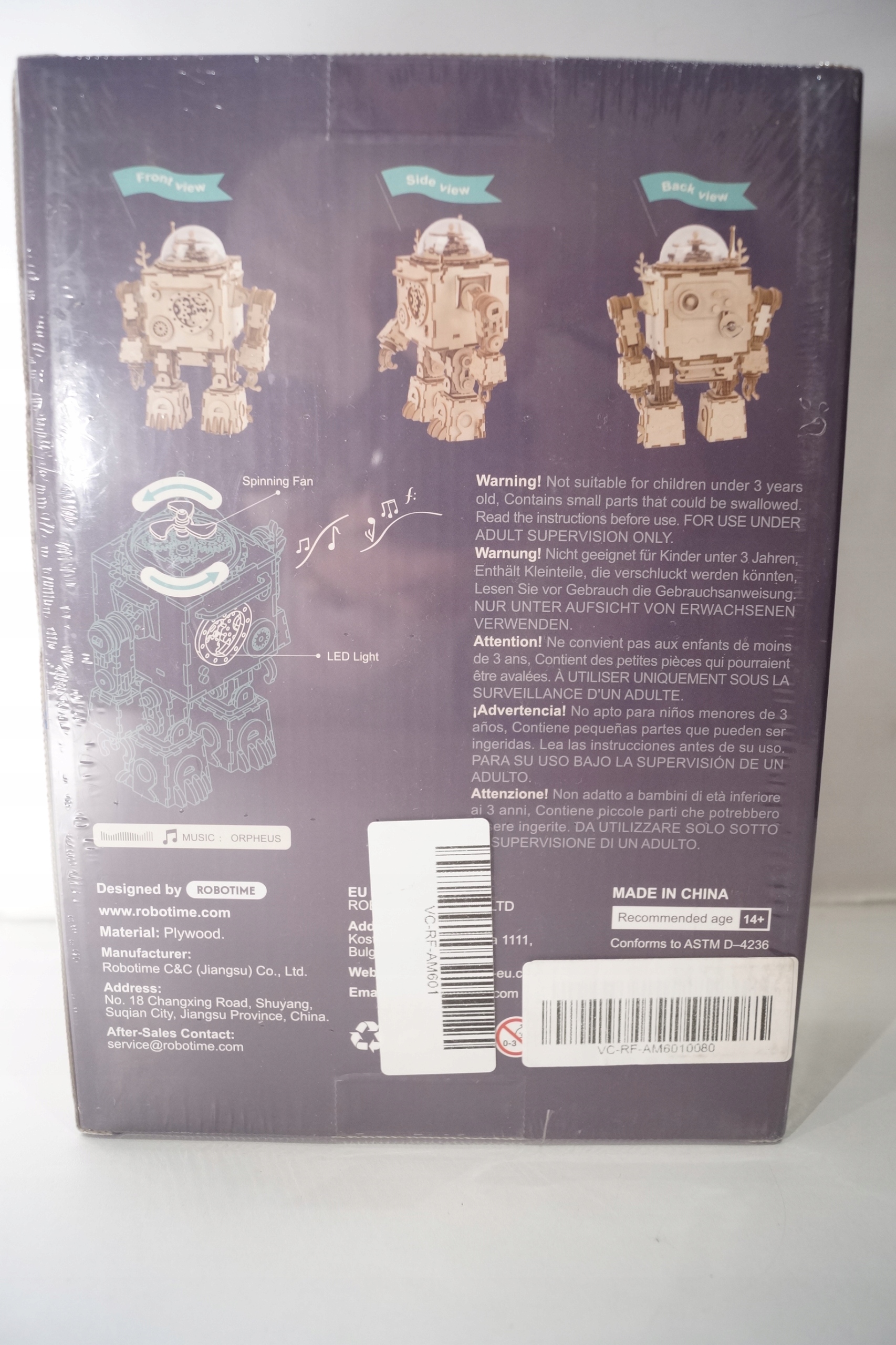 3D-пазл в стиле стимпанк с музыкальной шкатулкой и светодиодной подсветкой, выполненный из высококачественной фанеры. В модели имеется механизм, который после завода воспроизводит мелодию, зажигает диод и заставляет шестеренки внутри акрилового купола робота начать вращаться. Набор представляет собой листы с предварительно вырезанными и пронумерованными элементами, которые перед сборкой необходимо отделить от выкройки, а затем соединить в соответствии с подробной инструкцией, входящей в комплект поставки. Мелодия музыкальной шкатулки: «Не могу оторвать глаз от тебя»