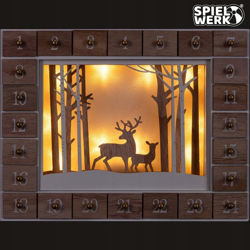 10 теплых белых светодиодов освещают центральные окна календаря. Переключатель включения/выключения расположен сзади. Календарь питается от 2 батареек АА (в комплект не входят). Благодаря продуманному взаимодействию различных рамок и уровней календарь действует как окно, через которое вы можете смотреть. В сочетании со светодиодной подсветкой создается 3D-эффект. Рождественский адвент-календарь станет подходящим подарком как детям, так и взрослым. Благодаря нашим адвент-календарям вы скрасите долгое ожидание вашим детям сочельника и принесете немного радости в каждый день. Адвент-календарь не ограничен по возрасту и даже не заполняя окна сюрпризами, он привносит праздничную атмосферу в ваш дом.