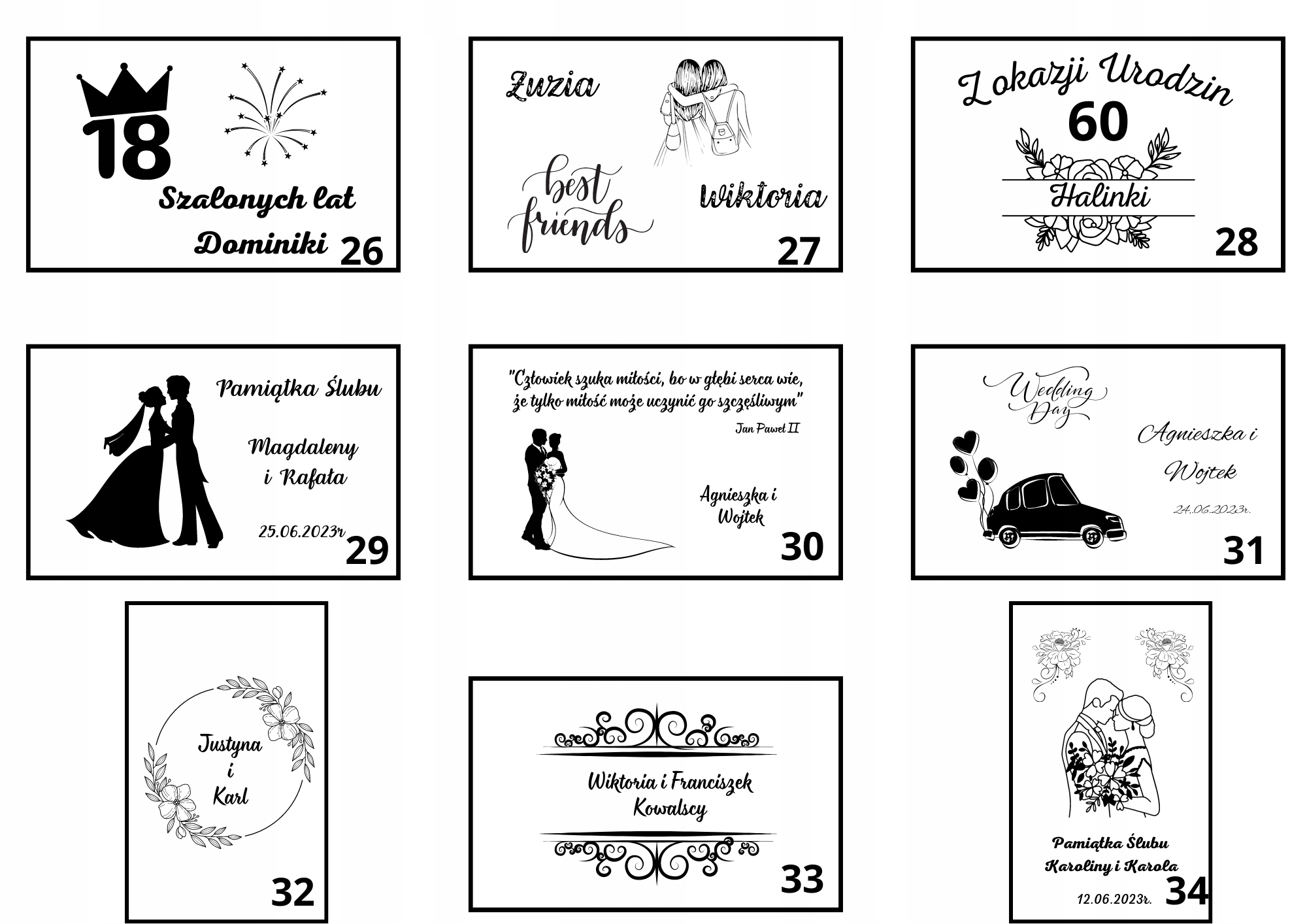 Возможен выбор готовых дизайнов (персонализация имен, дат, возможность свободного редактирования текста)