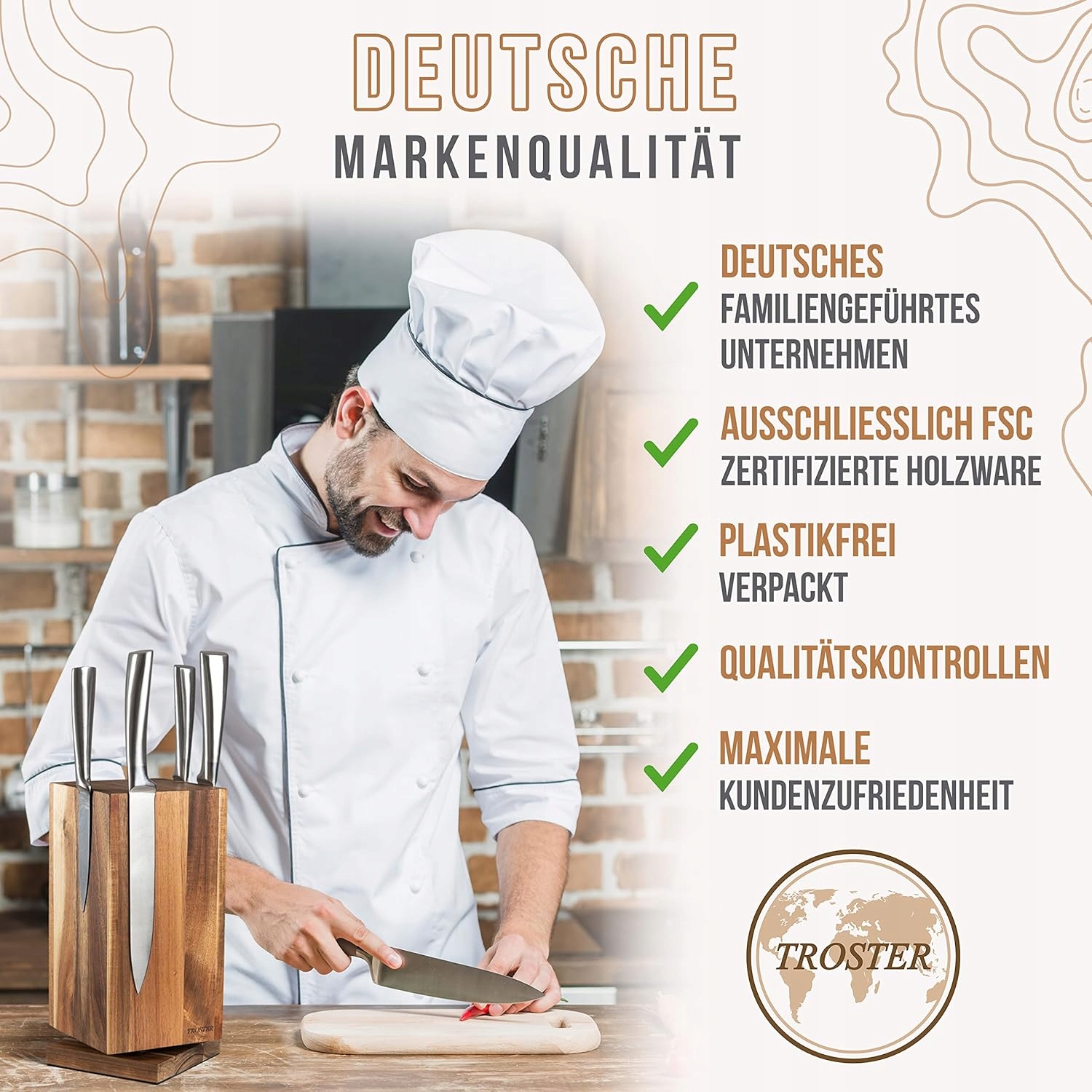 Трудно найти более привлекательное решение для хранения ножей. Кроме того, используемая древесина акации на 100% сертифицирована FSC. Кроме того, мы сознательно воздерживаемся от использования пластика в упаковке. Дополнительно к каждому блоку прикрепляем самоклеящийся противоскользящий коврик.
