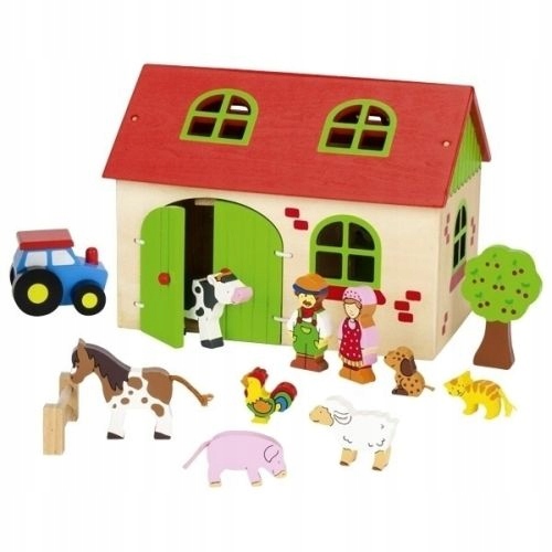 Ферма дополнена фигурками фермера и его жены, трактора, лошади, коровы, петуха, овцы, свиньи, кошки и собаки. Чтобы корпус лучше отражал реальность, производитель - немецкая компания Goki - даже добавил растительный элемент - дерево.