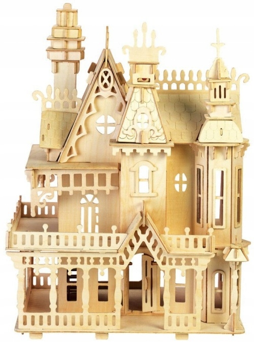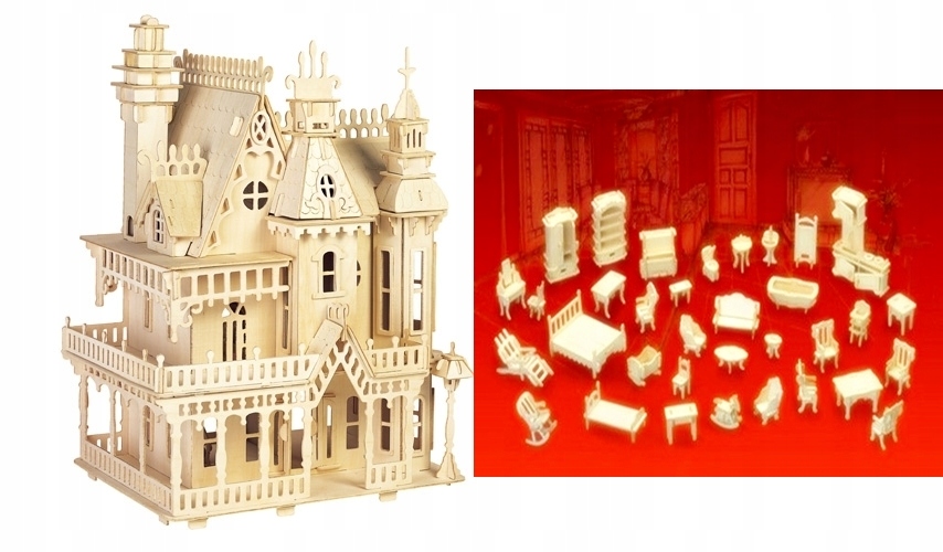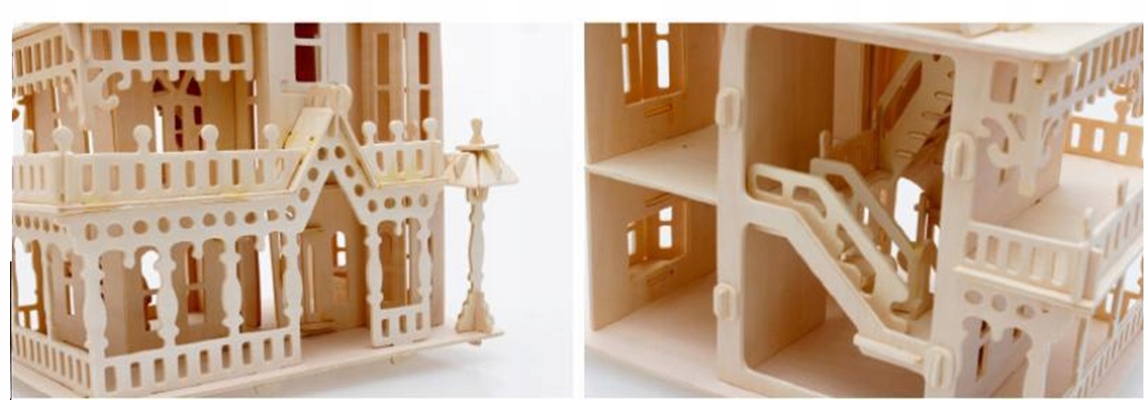 Необычная вилла + 34 предмета мебели из деревянных 3D пространственных пазлов для самостоятельной сборки. Вилла представляет собой двухэтажный дом с открытой спинкой, благодаря чему дети могут расставить мебель и оформить интерьер по своему желанию. Увлекательное развлечение, сочетающее элементы творческой работы с развитием пространственного воображения и ручных навыков детей. Готовые элементы при сборке следует систематически выдавливать из деревянной фанеры, согласно инструкции по рисованию на упаковке. При необходимости загладьте края элементов наждачной бумагой. Всю вещь можно покрасить красками для дерева или украсить цветной фольгой и бумагой.Для обеспечения прочного и долговечного соединения конструкции можно использовать столярный клей. Обучающая игрушка, которая помогает маленьким архитекторам узнать о материалах и методах строительства. Это отличное занятие, сочетающее в себе развлечение с развитием пространственного воображения и углублением ручных навыков.