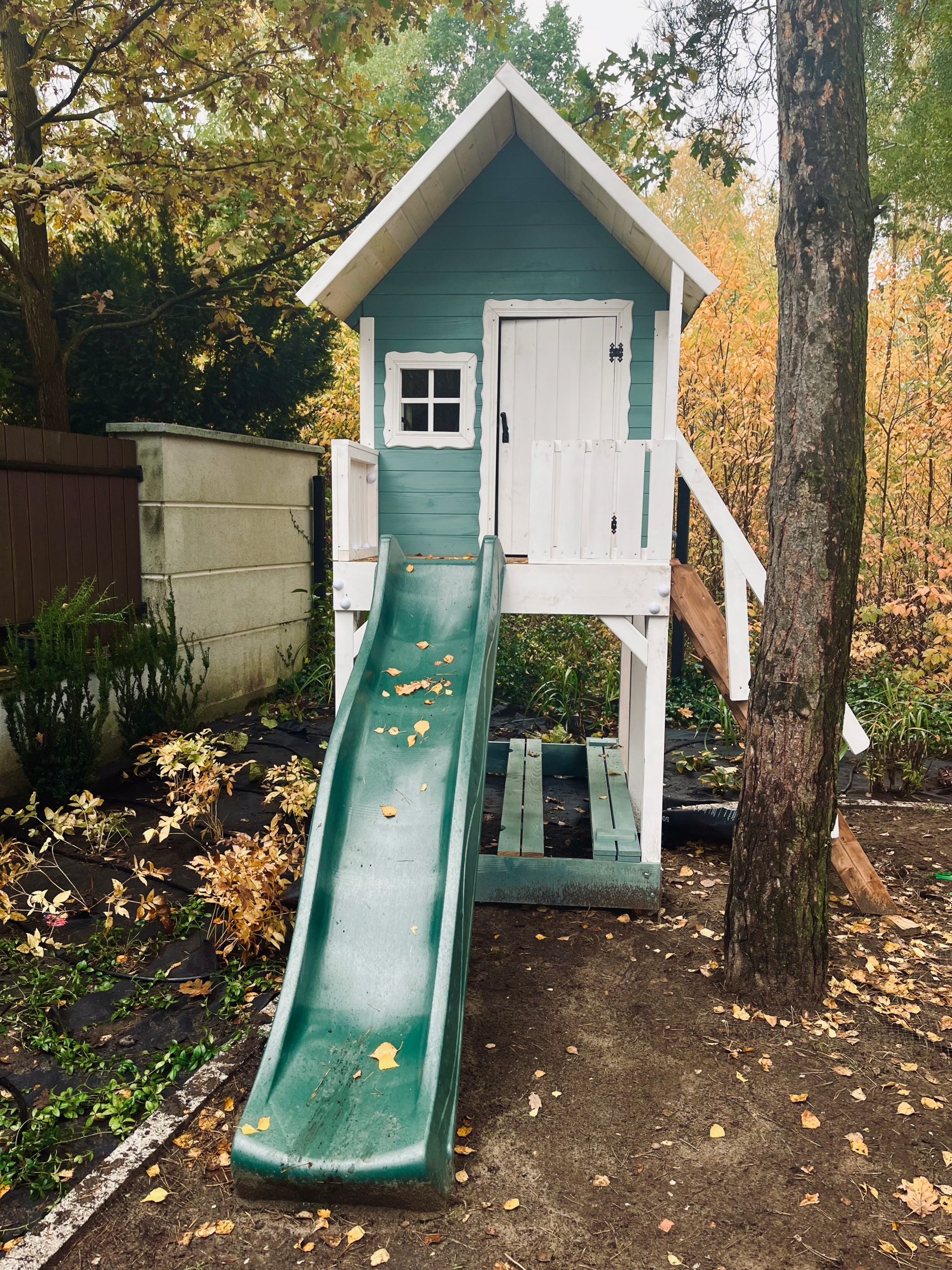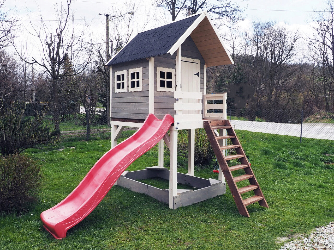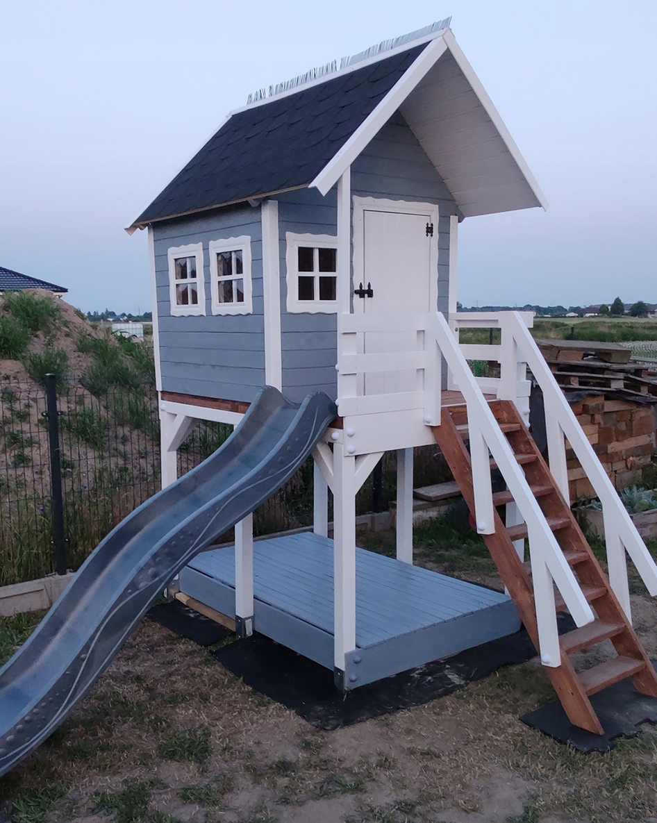 Деревянный дом на платформе со слайдом и песочницей h1>