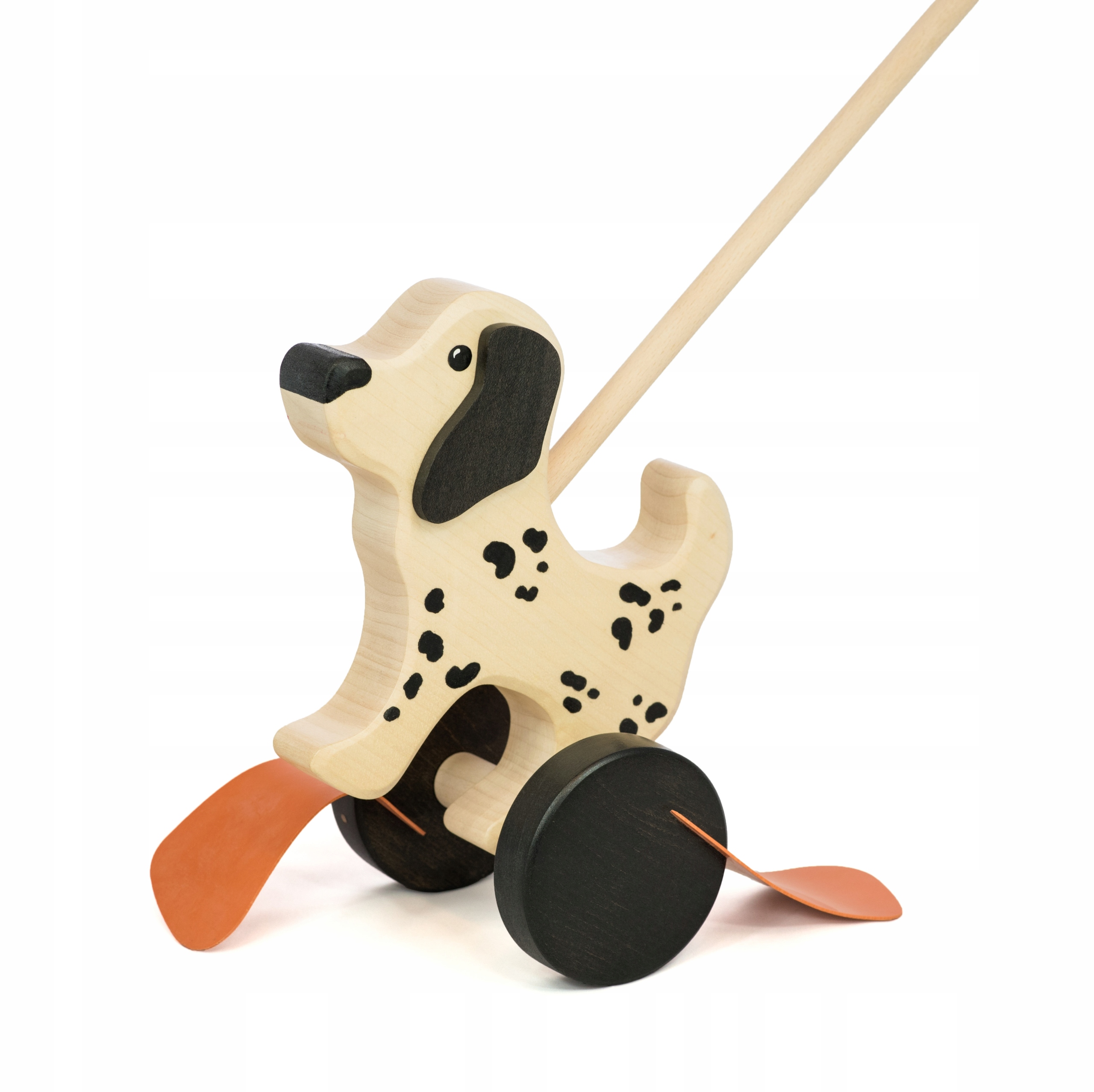 - набор состоит из деревянная собака на двух колесах, с прикрепленной к спине палкой, чтобы было легче катить игрушку.