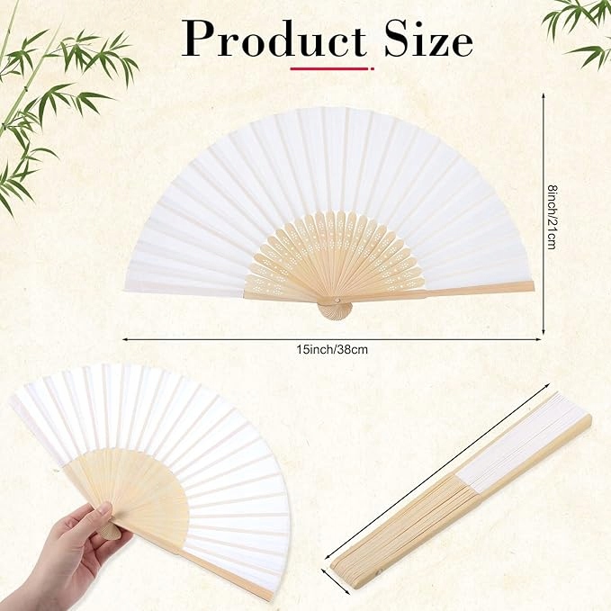 - Многие функции: основная цель этого замечательного ручного поклонника бамбука - обеспечить ветер и охлаждение в жаркие летние дни, в то время как их можно эффективно использовать в качестве партийных реквизитов, аксессуаров для свадебных украшений, сувениров или подарков на свадьбах, вечеринках или других мероприятиях, и вы можете использовать их в качестве рекламных материалов