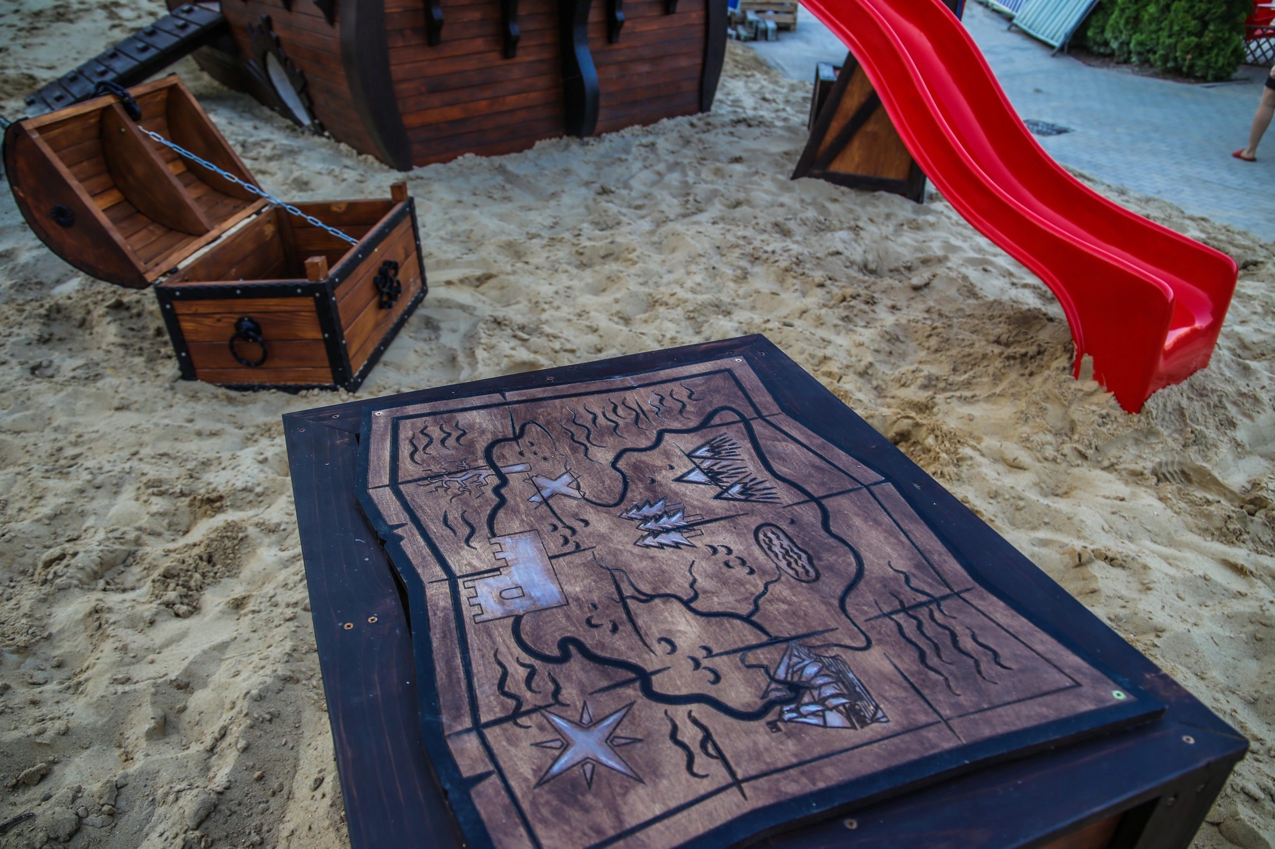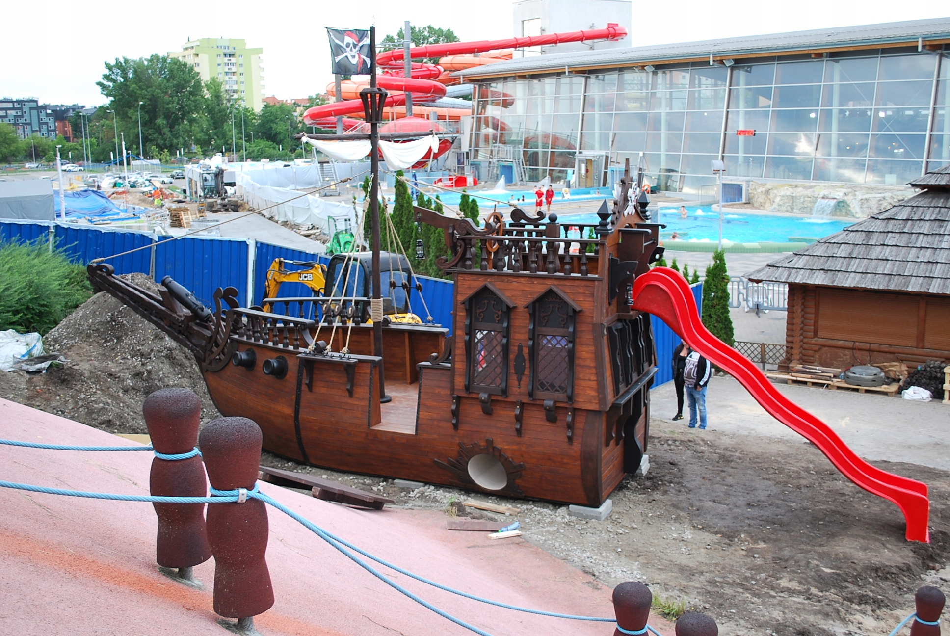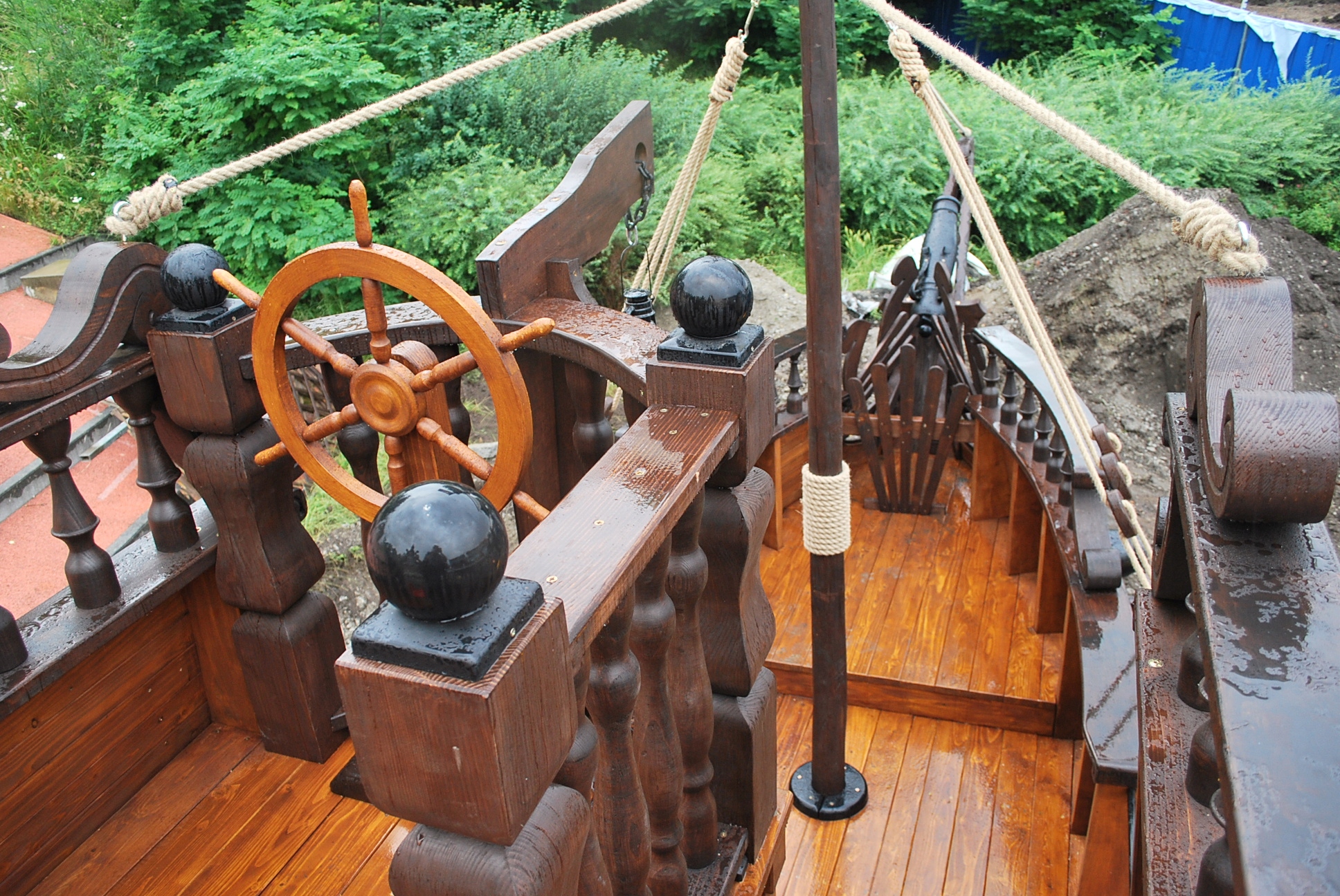- размеры пиратского корабля: ширина 2,5 м; длина 9м с качелями; высота рулевой рубки около 4м, высота мачты 5,5м
