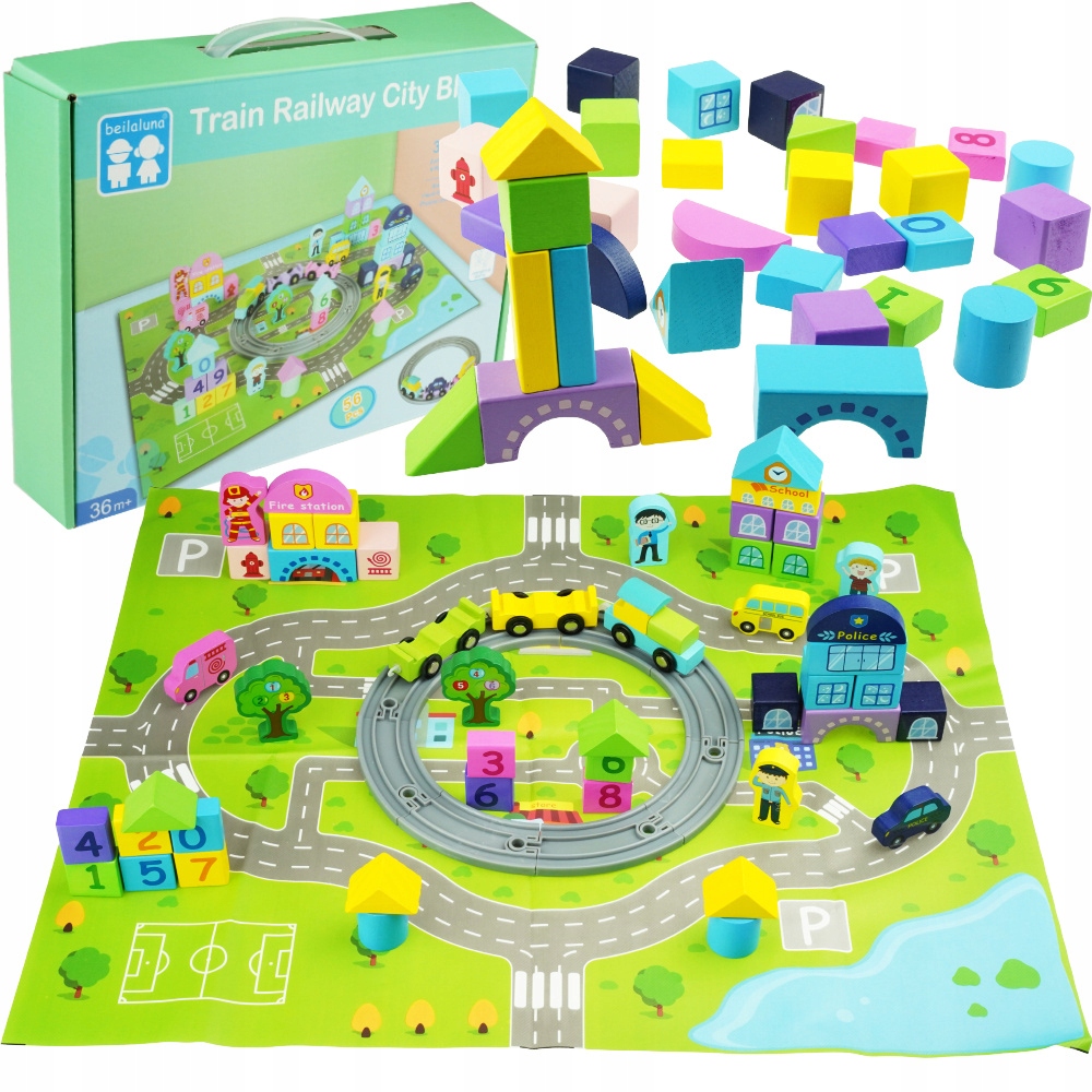В комплект входят многочисленные блоки для строительства города и коврик с круговой развязкой для машин.