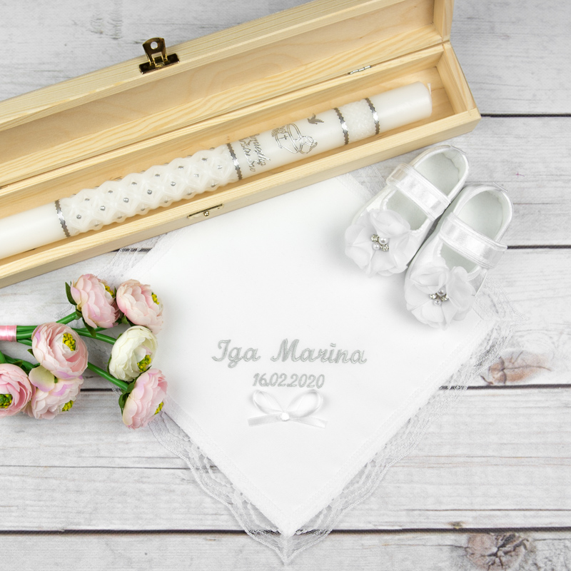 Дерев'яний футляр для хрестильної свічки - білі квіти