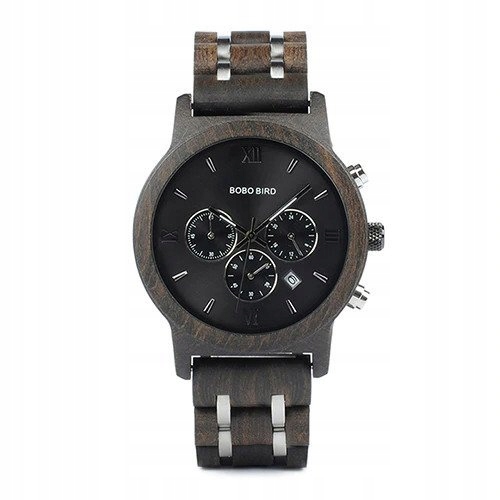 Bobo Bird Lux Dark P19-1 — элегантные мужские часы. Уникальное сочетание дерева и металла в браслете дает потрясающий эффект, а также очень прочно. На темном циферблате расположены три функциональных циферблата меньшего размера и указатель даты. Стекло Hardlex было специально закалено, что сделало его очень устойчивым к царапинам.