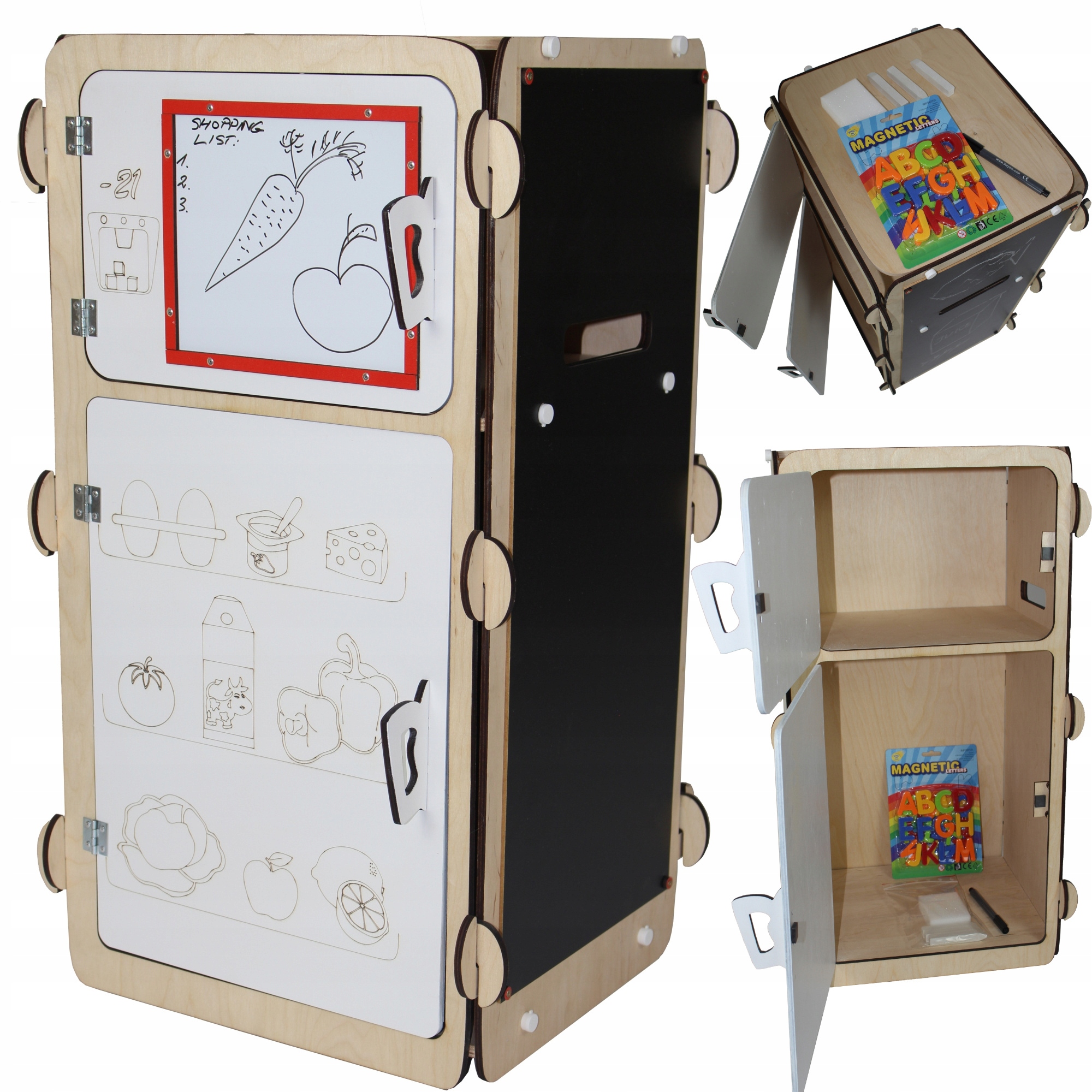 Большой деревянный холодильник со стенками, оснащенными меловой и магнитно-меловой доской — отличная идея для творческого развлечения для ваших детей. Обучение через игру – лучший способ правильного развития детей. Стены холодильника — идеальное место для тренировки первых букв и цифр. Это также отличное место для развития вашего художественного чутья, создавая великолепные рисунки. С одной стороны это доска для письма маркерами, с другой - традиционная меловая доска. Сторона доски, предназначенная для сухого стирания, магнитная — идеально подходит для крепления магнитов! Холодильник с просторными отделениями для хранения — отличный способ поиграть в школу дома!