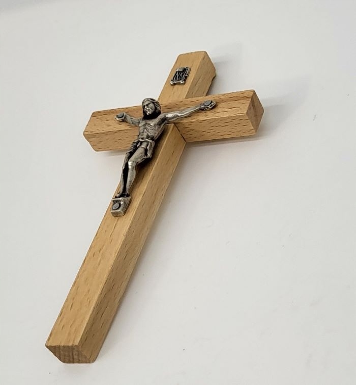 Деревянный крест на стене с фигурой Иисуса в серебристом 16 см.