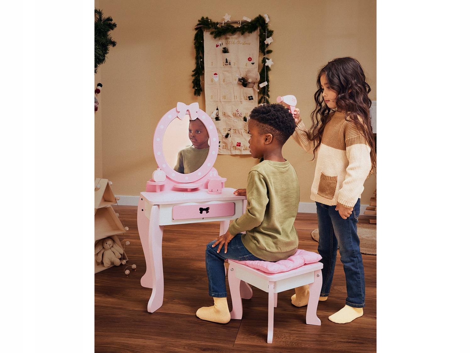 Деревянный туалетный столик для детей, играя с большим зеркалом, табуретом и аксессуарами h2>