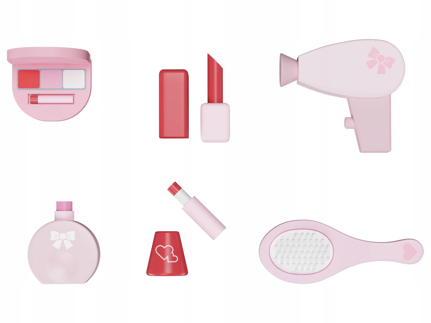 - Включенные деревянные аксессуары: 1 лак для ногтей, 1 духи с насосом, 1 помада, 1 тени для век, 1 щетка для волос, 1 фен с пуговицами Элементы
