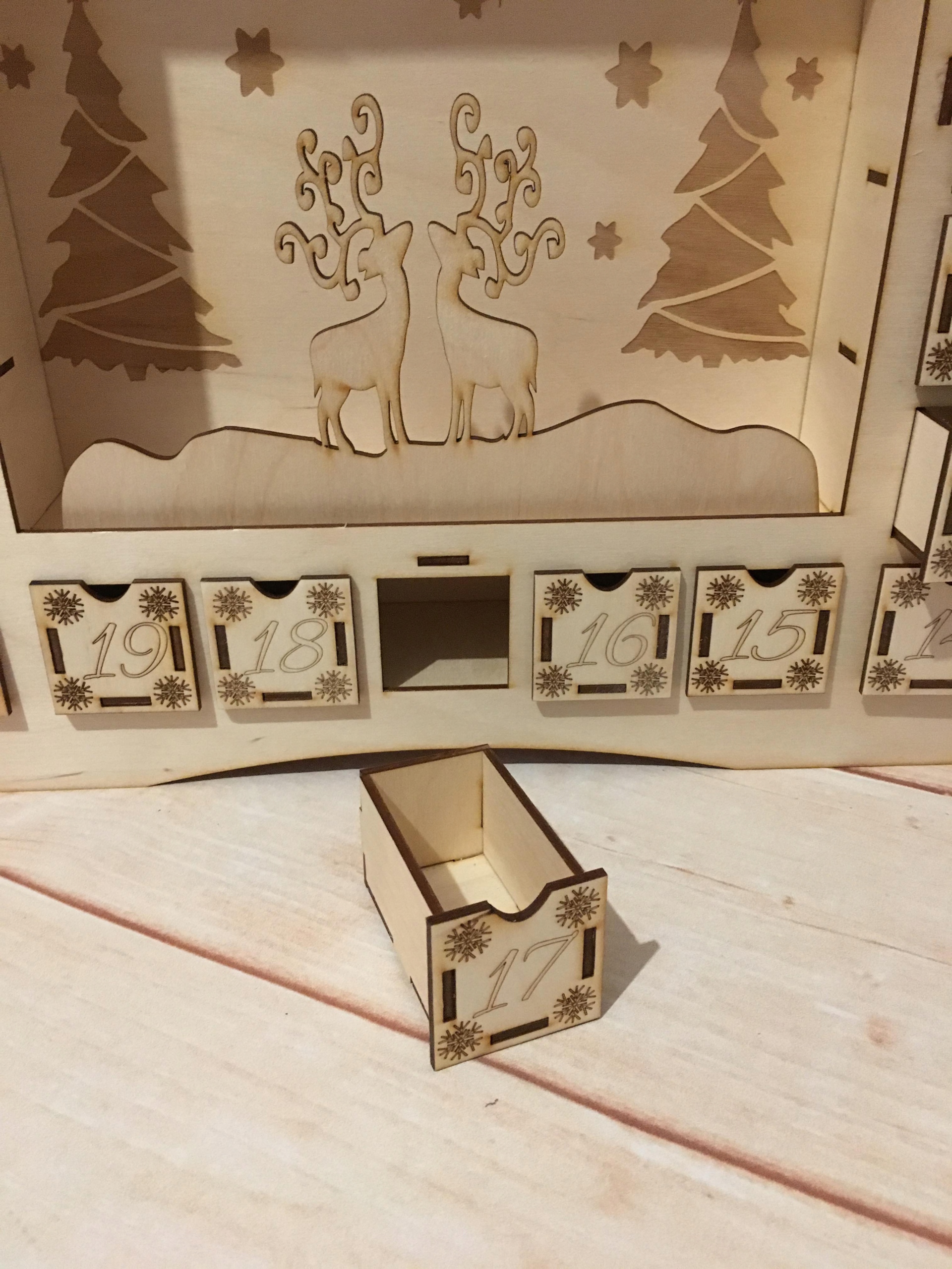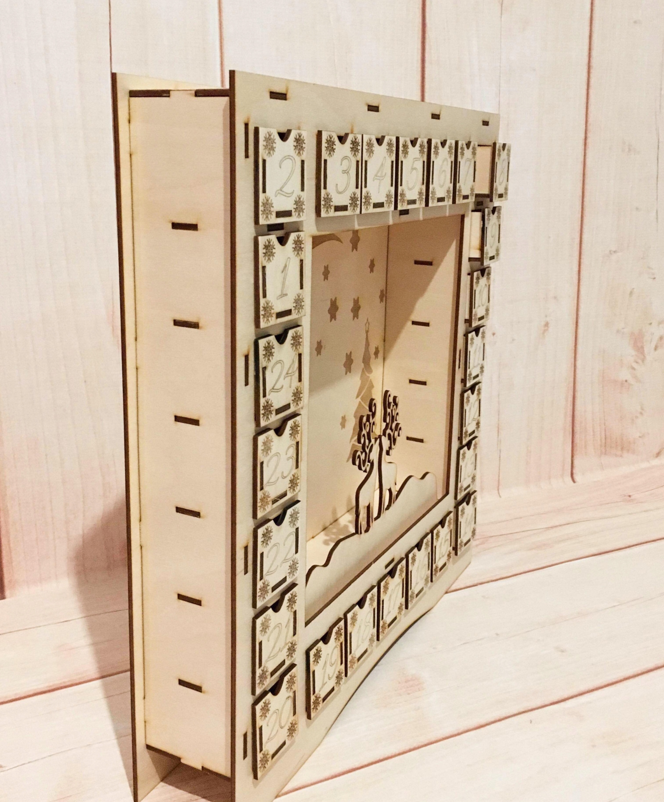Календарь в форме квадрата с 24 ящиками для сладостей или мелочей и рождественской гравировкой с оленями.