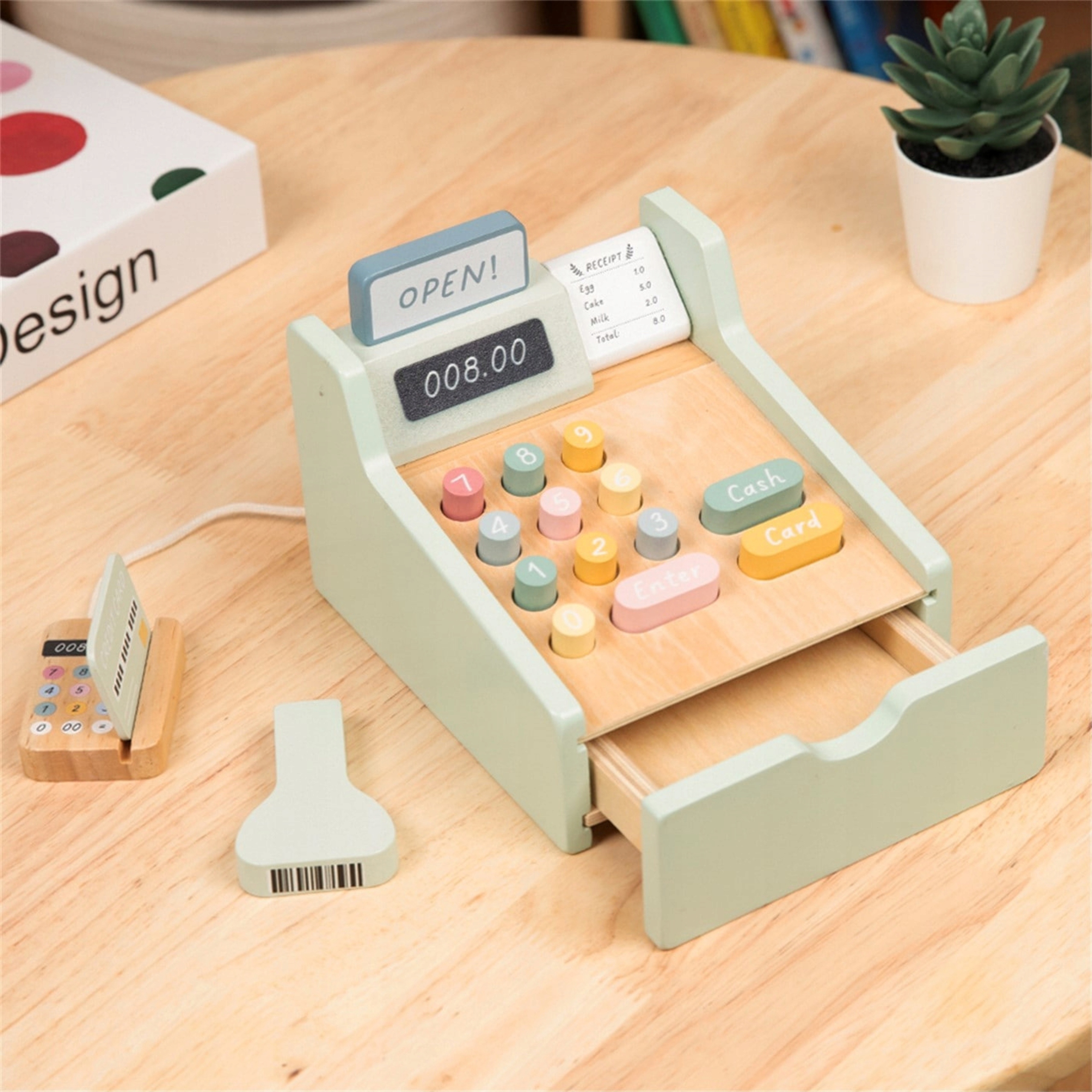ДЕРЕВЯННЫЙ КАССОВЫЙ АППАРАТ СКАНЕР МАГАЗИН АКСЕССУАРЫ ДЕНЬГИ ВУПИ ЗЕЛЕНЫЙ