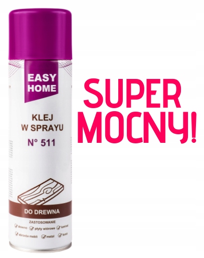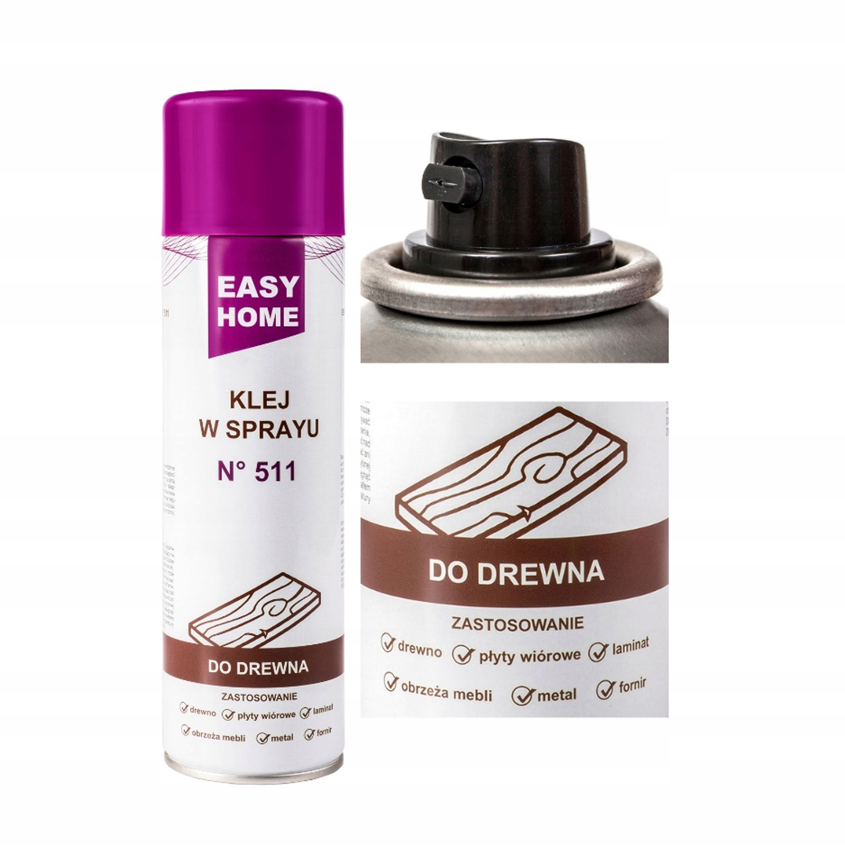 Клей для дерева - Easy Home 511 - новое поколение, исключительно прочный контактный спрей-клей, устойчивый к температуре до 110oC. Идеально подходит в качестве клея для всех видов древесины, а также шпона, ламината и твердого пластика. Благодаря уникальной смеси с очень высоким содержанием сухих веществ он отличается чрезвычайно высокой прочностью сцепления. После того как элементы соединены, их невозможно разделить. Кроме того, клей моментально схватывается, что позволяет проводить быструю механическую обработку склеиваемых материалов, сокращая время сборки. Удобное нанесение с помощью распылителя облегчает и ускоряет работу.