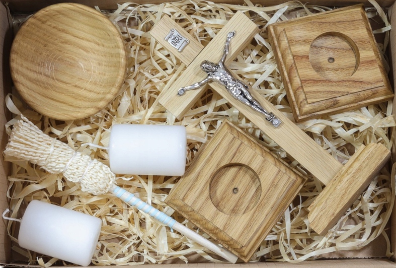 Набор состоит из 7 элементов - креста, двух подсвечников, двух свечей, чаши для святой воды и окропителя.