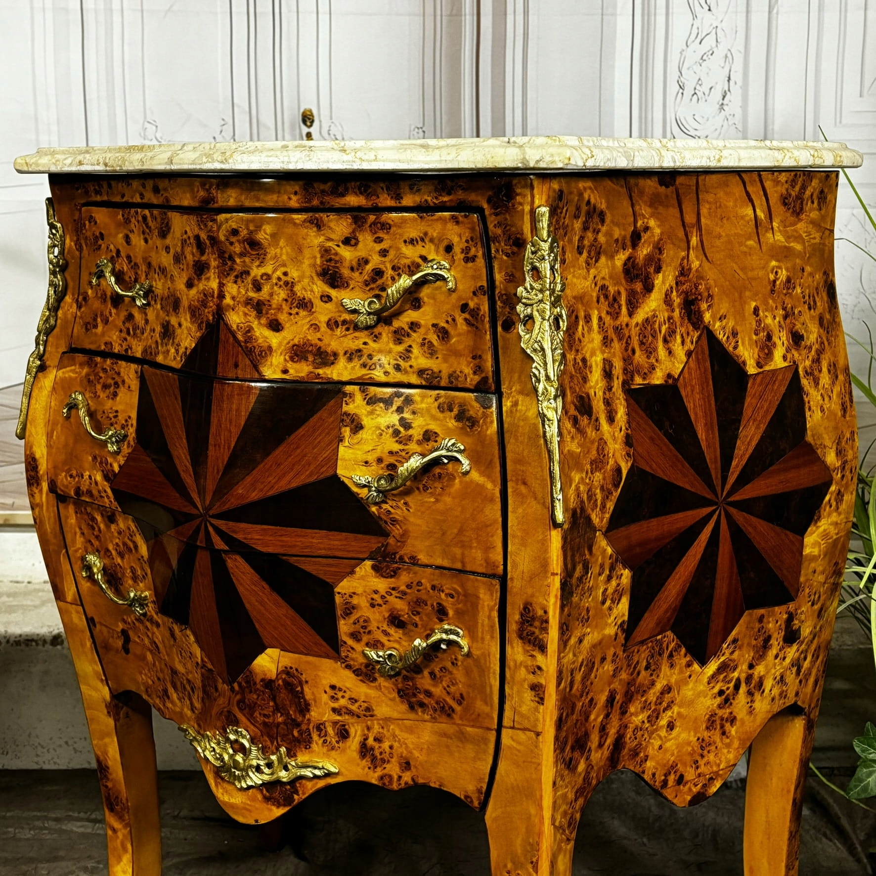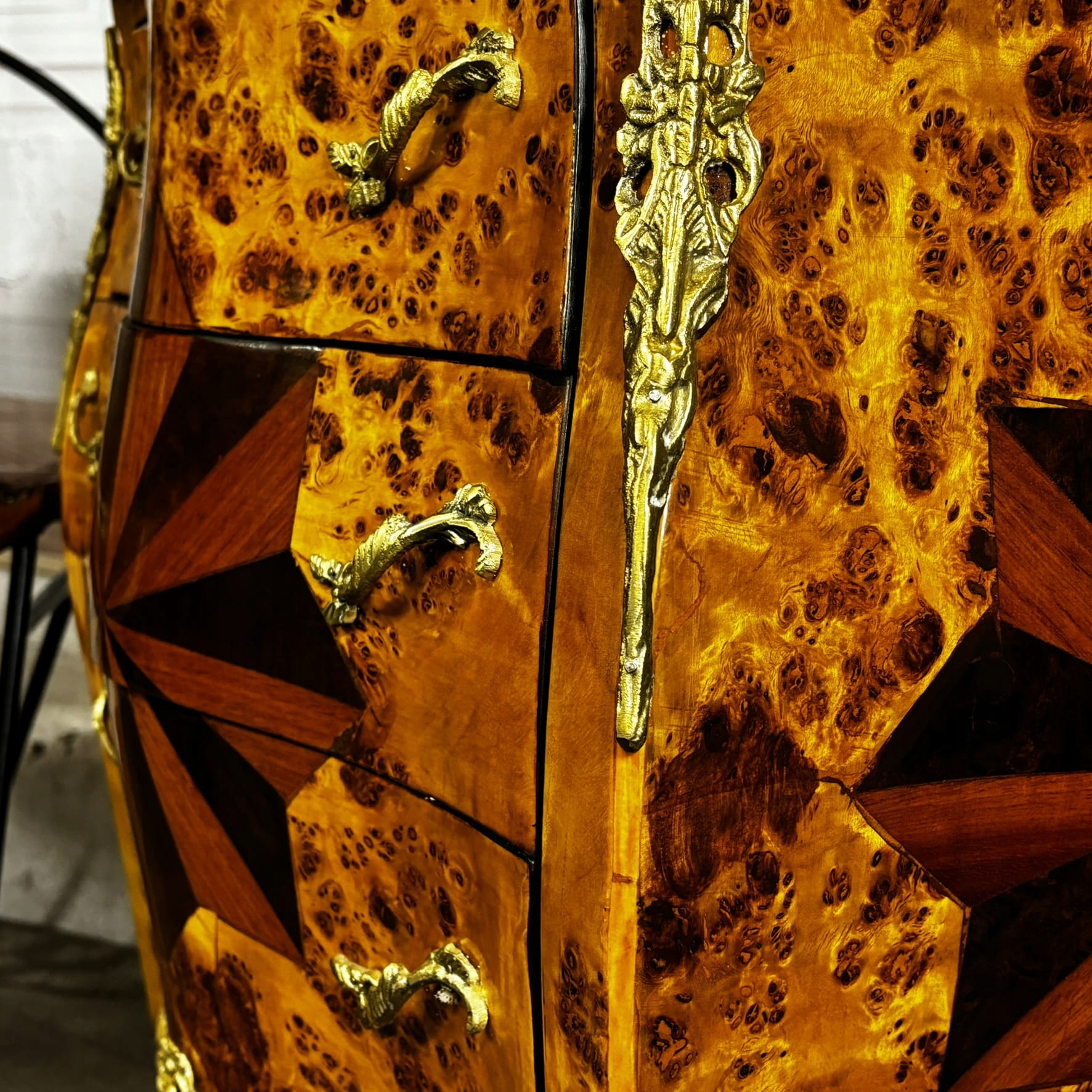 Каповое дерево и маркетри в форме звезды делают этот предмет мебели уникальным.