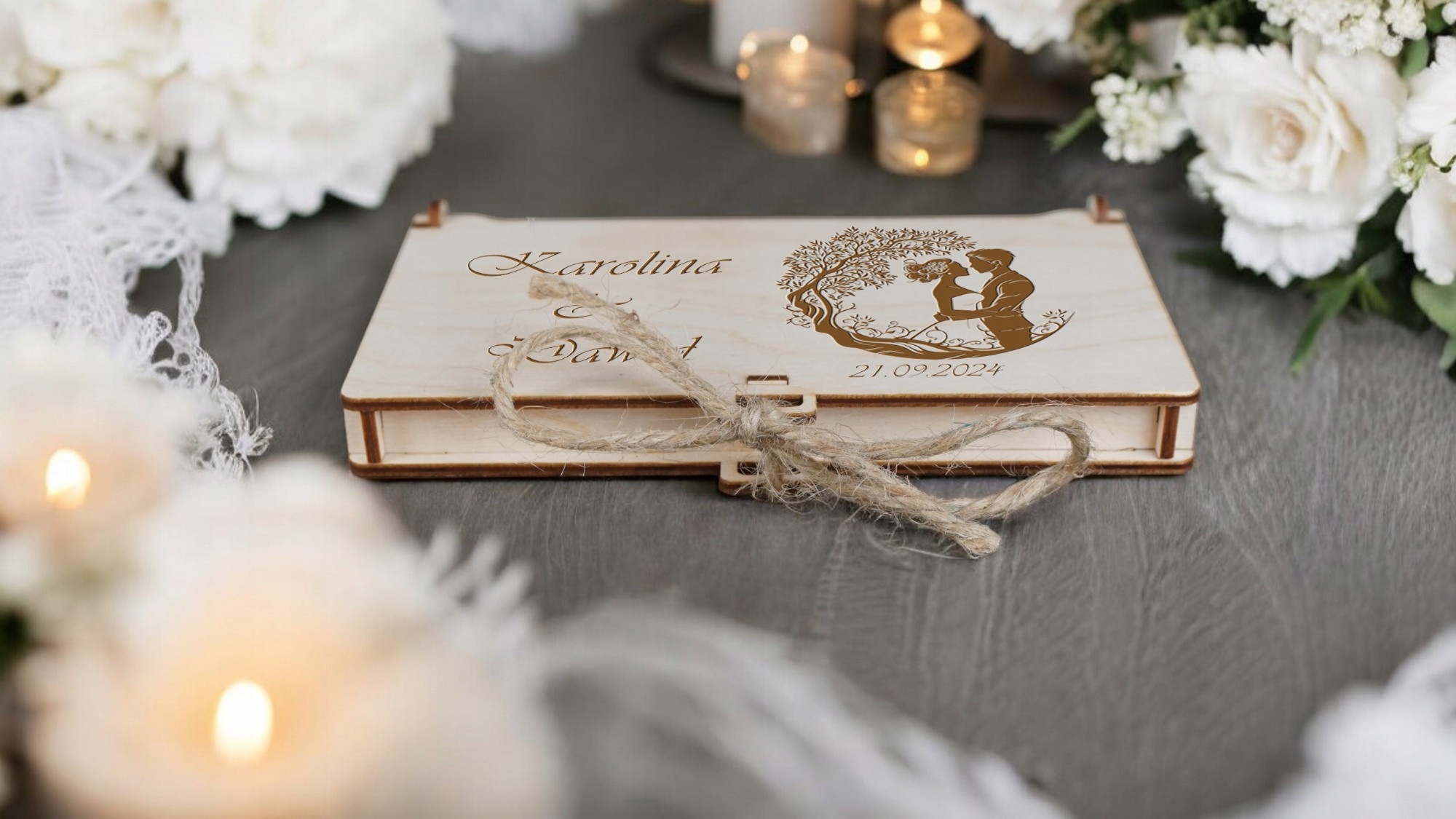 Шкатулка изготовлен из высококачественной фанеры. На передней стороне коробки будет выгравирован выбранный вами свадебный мотив, дата свадьбы и имена жениха и невесты. Внутри коробки будут храниться пожелания, выбранные из списка ниже, и информация о том, кто их исполняет. Вы также можете выбрать ленту, которой будете закрывать коробку.