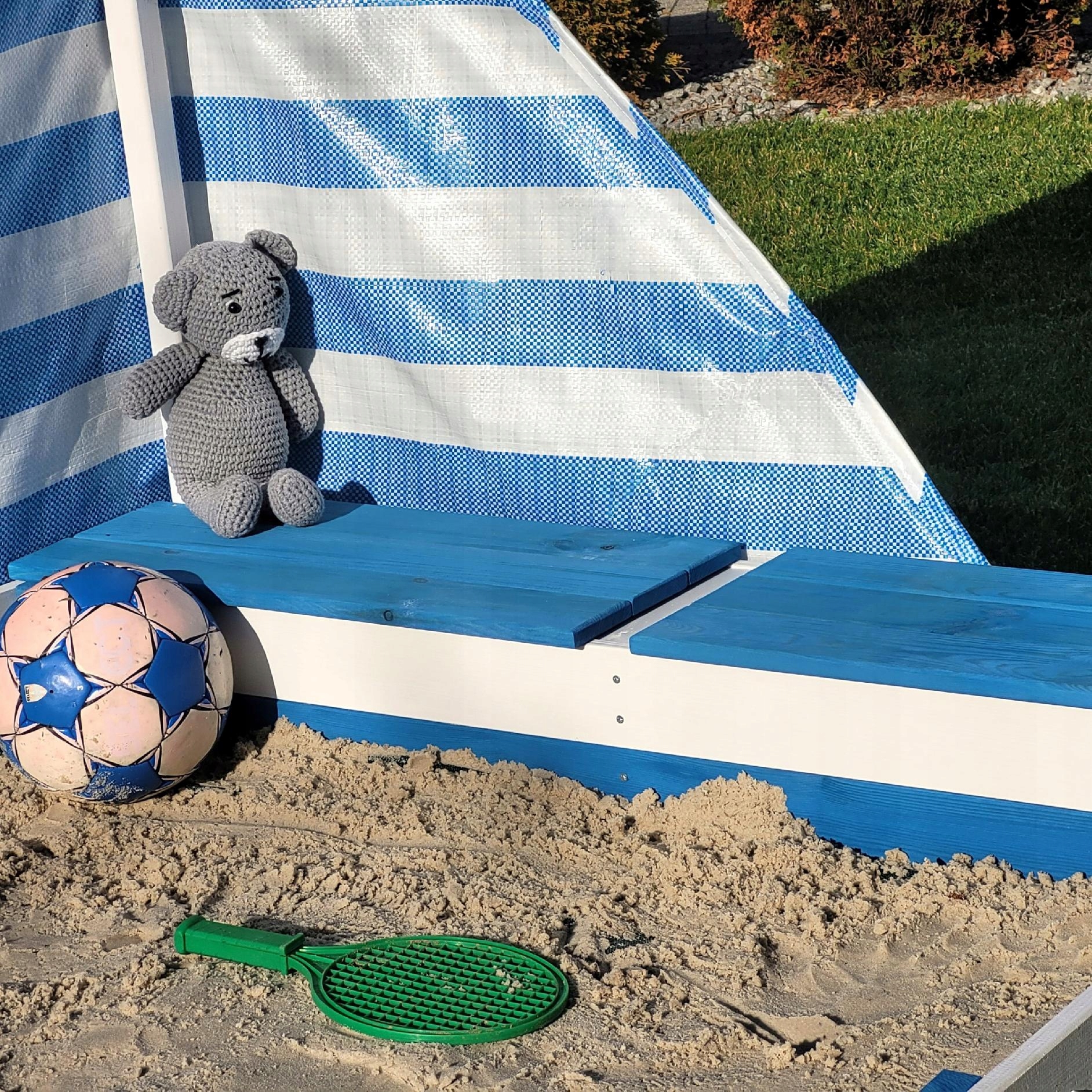 Большая сине-белая песочница в форме корабля стимулирует воображение детей и заставляет их сердца бить быстрее.