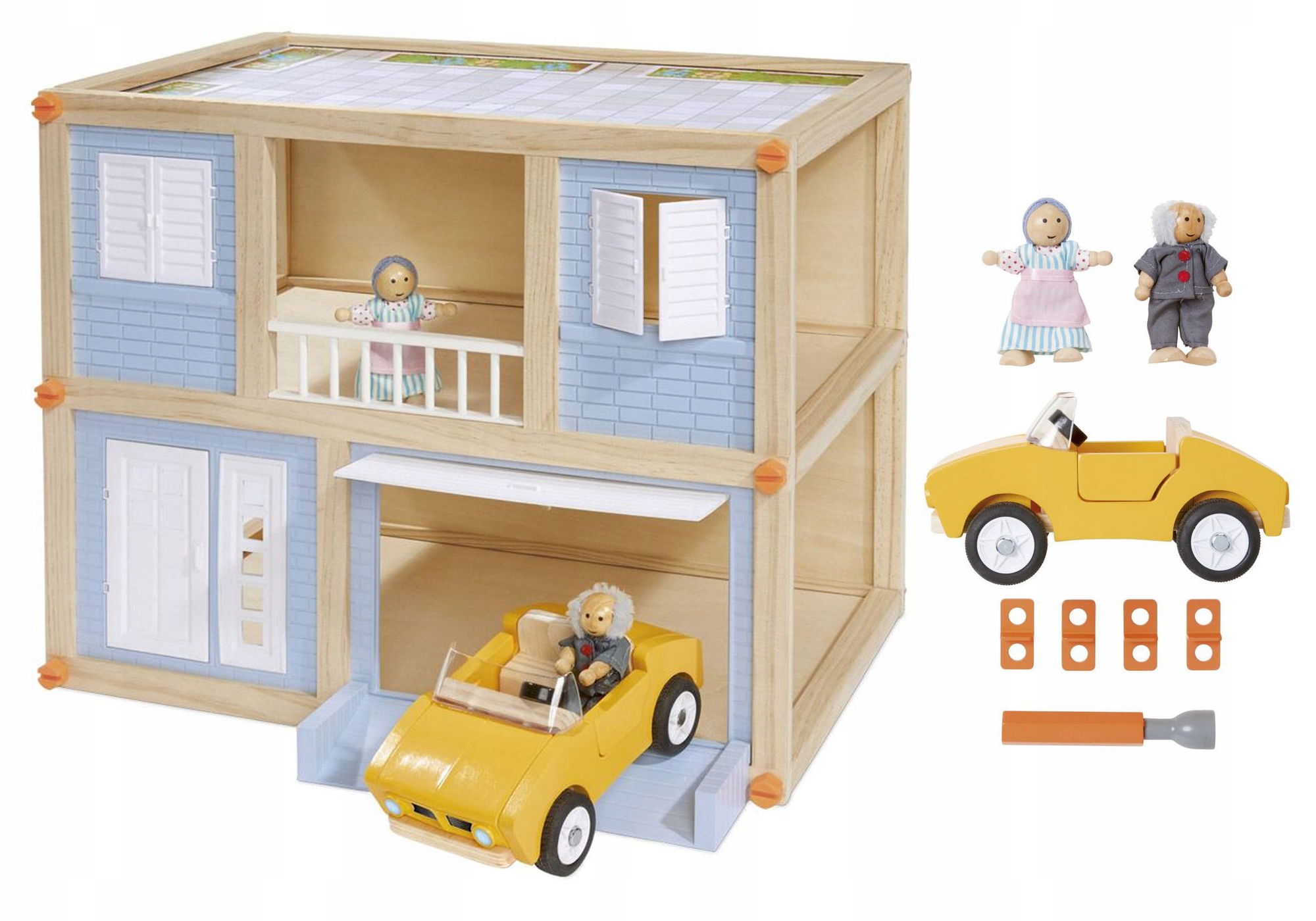 - в комплект входят 2 гибкие куклы, 1 машина с раздвижными дверями, пандус для гаража, деревянный торцевой ключ и пластиковые шурупы.