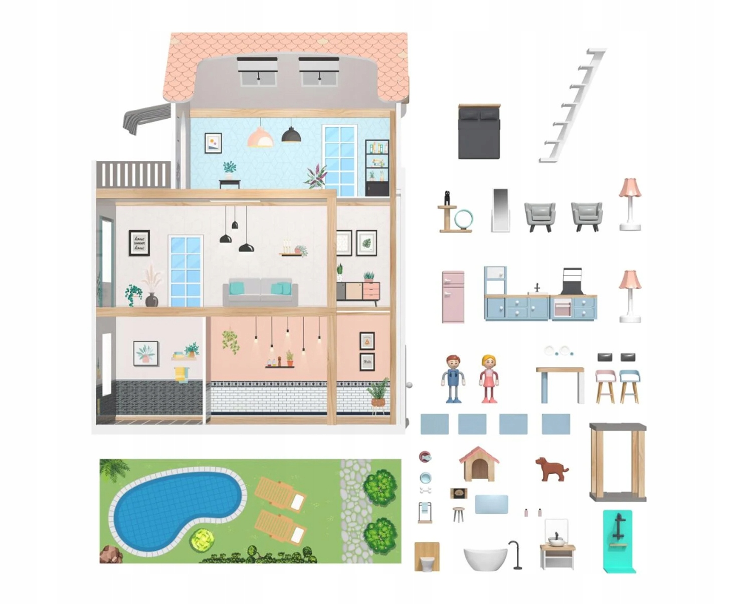1 дом, 1 садовая фольга с двусторонним принтом, 1 лестница, 1 кухонный шкаф, 1 раковина, 1 холодильник, 1 кухонная стойка с 2 тарелками и 2 чашками, 2 кухонных табурета с 2 подушками для сидений, 1 кровать с 2 подушками и 1 одеяло, 1 шт. Зеркало, 2 кресла с 2 подушками для сидения, 1 умывальник с зеркалом и 2 бутылки шампуня, 1 унитаз, 1 ванна с 1 краном, 1 душ, 1 табурет, 1 вешалка для полотенец с 2 полотенцами, 1 напольные весы, 4 коврика для ванной, 2 гибкие куклы, 1 дверной звонок, 2 торшера, 1 собачья будка, 1x Собака, 1 миска для еды, 1 кость, 1 кошачье дерево, 1 кошка, 1 миска для кошачьей еды, 1 рыба.