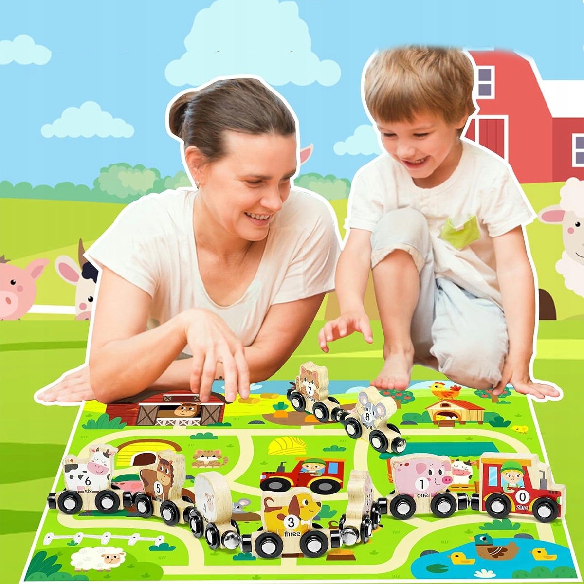 В комплект поезда для сельскохозяйственных животных входят небольшой локомотив и вагончики для сельскохозяйственных животных (0–10), на каждой из которых напечатаны изображения животных с обеих сторон и цифры 0–10 на одной стороне. В комплект деревянного поезда также входит сумка для хранения и красочный игровой коврик с принтами на фермерскую тематику. Дети легко узнают животных и цифры в интерактивных играх с семьей и друзьями, и им они понравятся, как только они их получат.