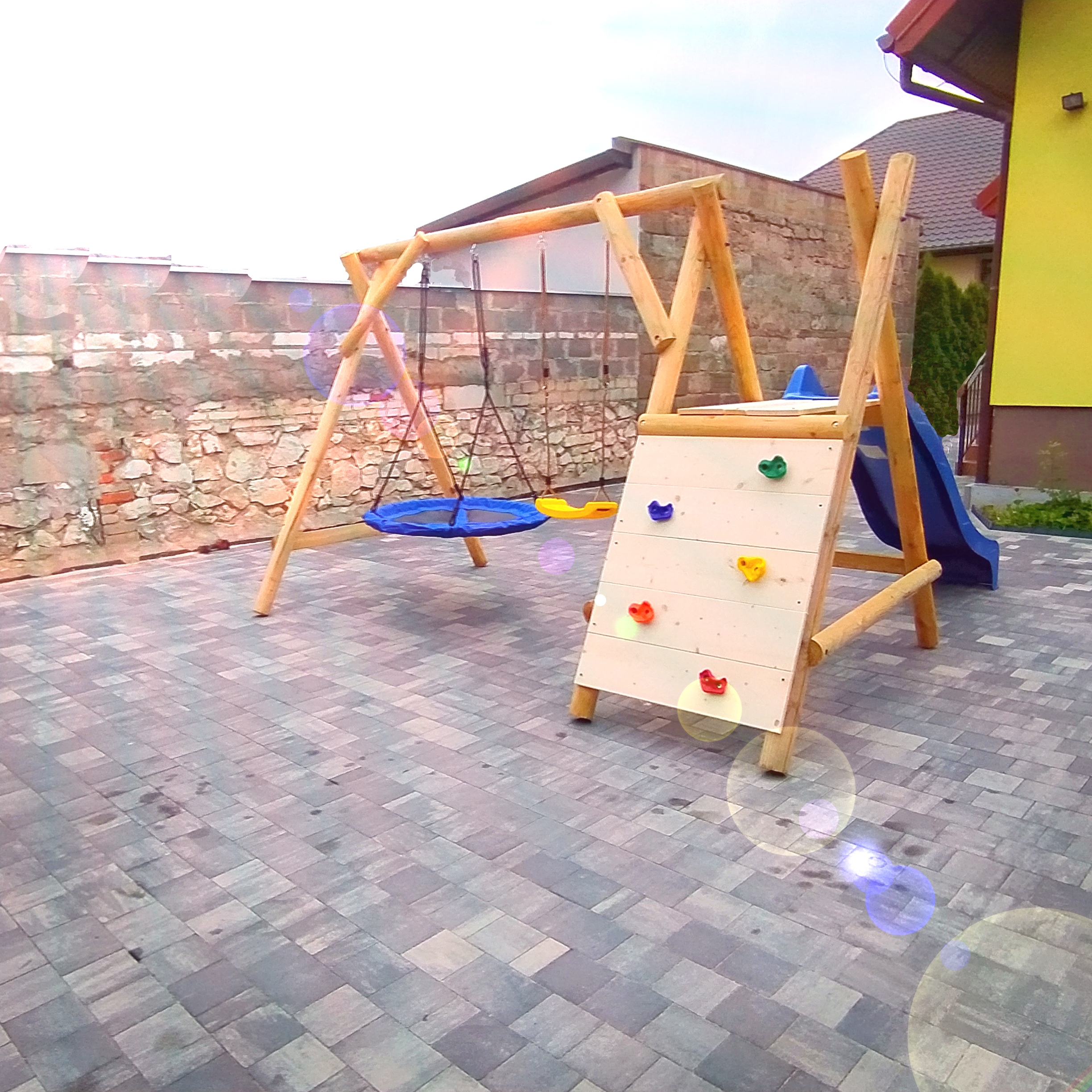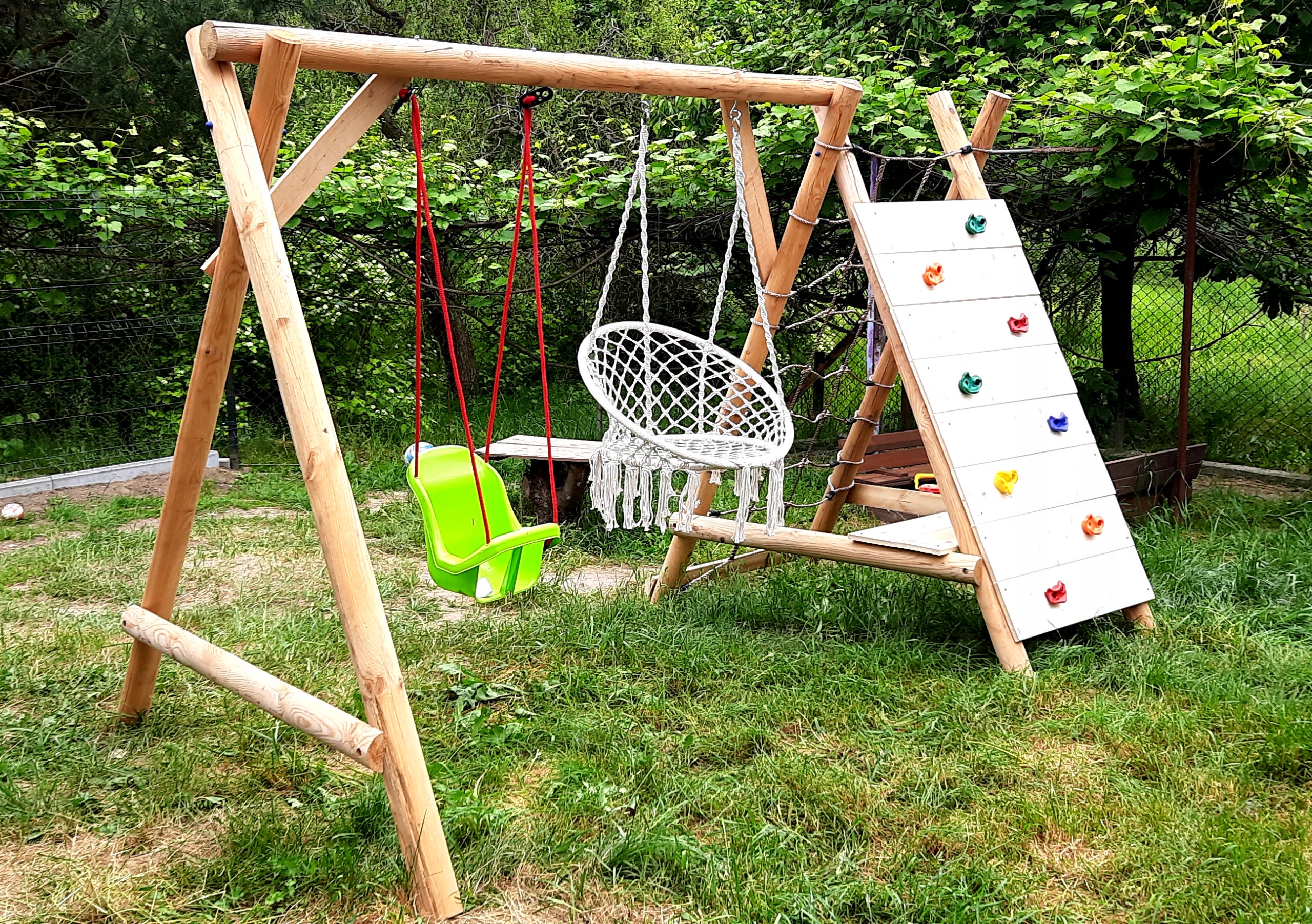 Представленный «WESOŁY PLAC MINI» непременно выполнит свою функцию даже в небольшом приусадебном участке. Ширина конструкции около 3,3 м. Наши комплекты изготовлены из катаного бревна* диаметром около 10 см.