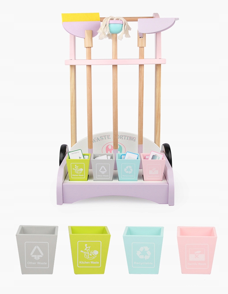Кроме того, в набор входят картонные карточки с картинками различные объекты, которые необходимо рассортировать по соответствующим контейнерам для мусора.
