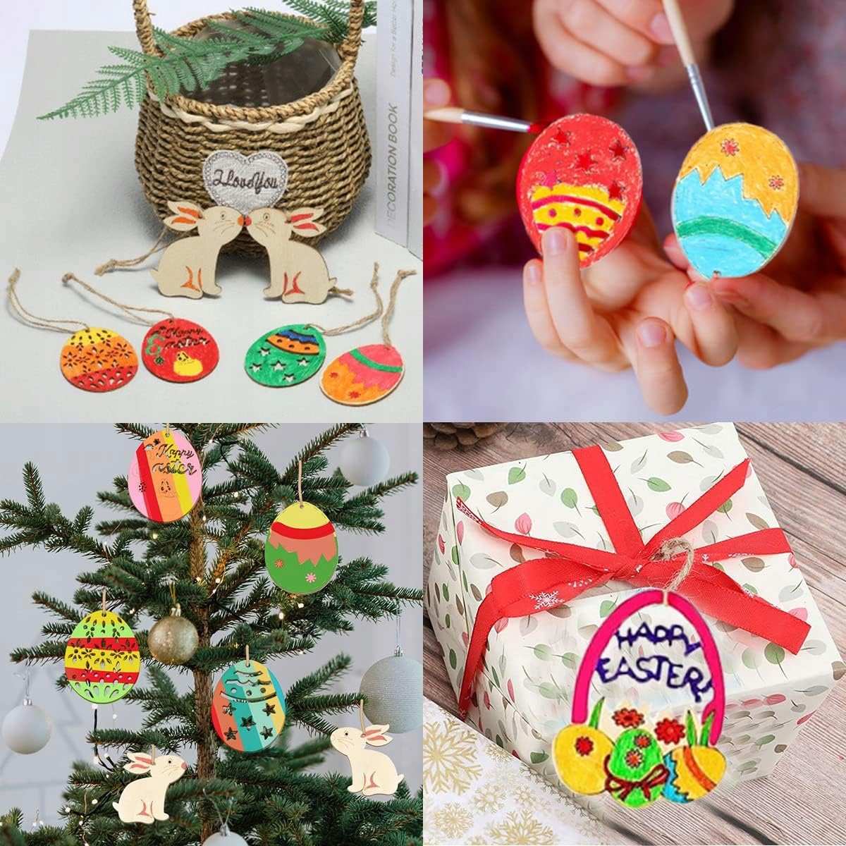 36 незаконченных деревянных украшений (3 куска X12 фигур) и 6 красочных метров и 36 хлопковых и льняных линий для подвешивания. Все традиционные элементы включены: пасхальные яйца, пасхальные кролики, цыплята и цветы
