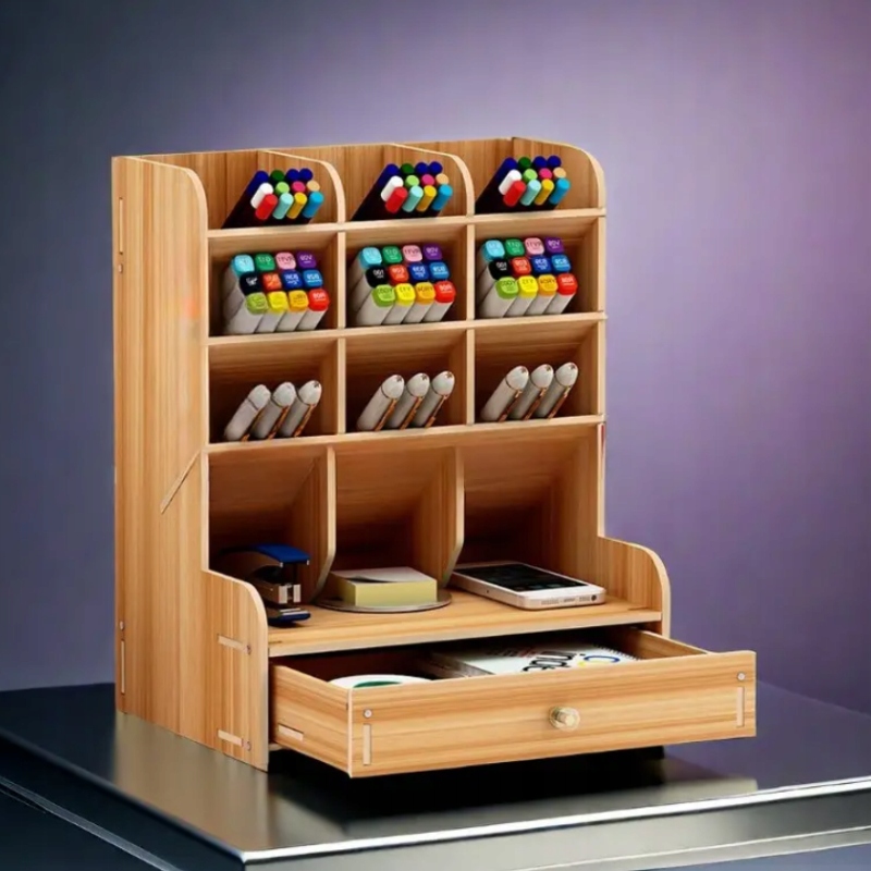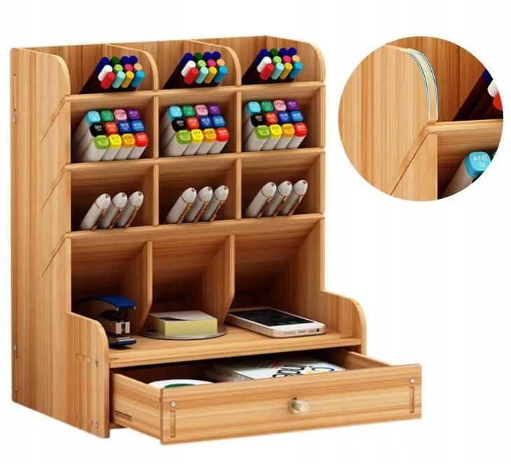 ✔️ Большая вместимость: Органайзер имеет множество полок, отделений и ящик. Здесь есть 9 отделений для канцелярских принадлежностей, 3 более глубокие полки для мелких канцелярских товаров и даже телефона или заметок. Внизу есть ящик, в котором можно хранить все самое необходимое.