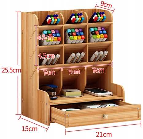Сам органайзер состоит из 12 отделений и одного ящика, которые позволяют хранить самые разные вещи – от школьных принадлежностей до мелких личных аксессуаров. Он также идеально подходит для офиса, школы и даже дома, помогая поддерживать чистоту и порядок на вашем столе. Благодаря творческому проекту «Сделай сам» пользователь может собрать органайзер самостоятельно, что легко и быстро благодаря прилагаемым винтам.