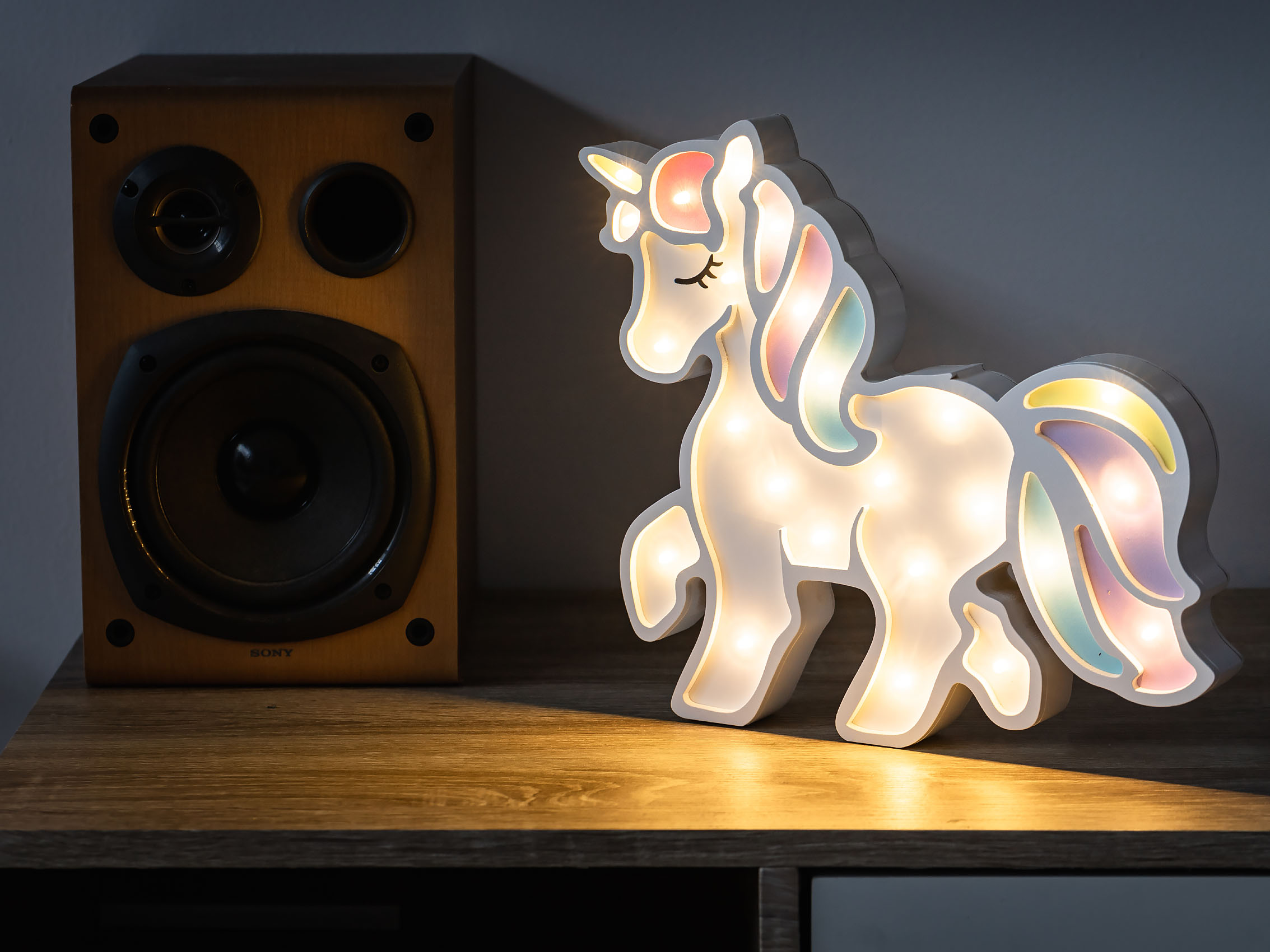 НОЧНИК СЧАСТЛИВОГО БЕГЕМЯ, БЕЛЫЙ ЕДИНОРОГ, ДЕРЕВЯННЫЙ, СВЕТОДИОДНЫЙ СВЕТ С ДИОДАМИ