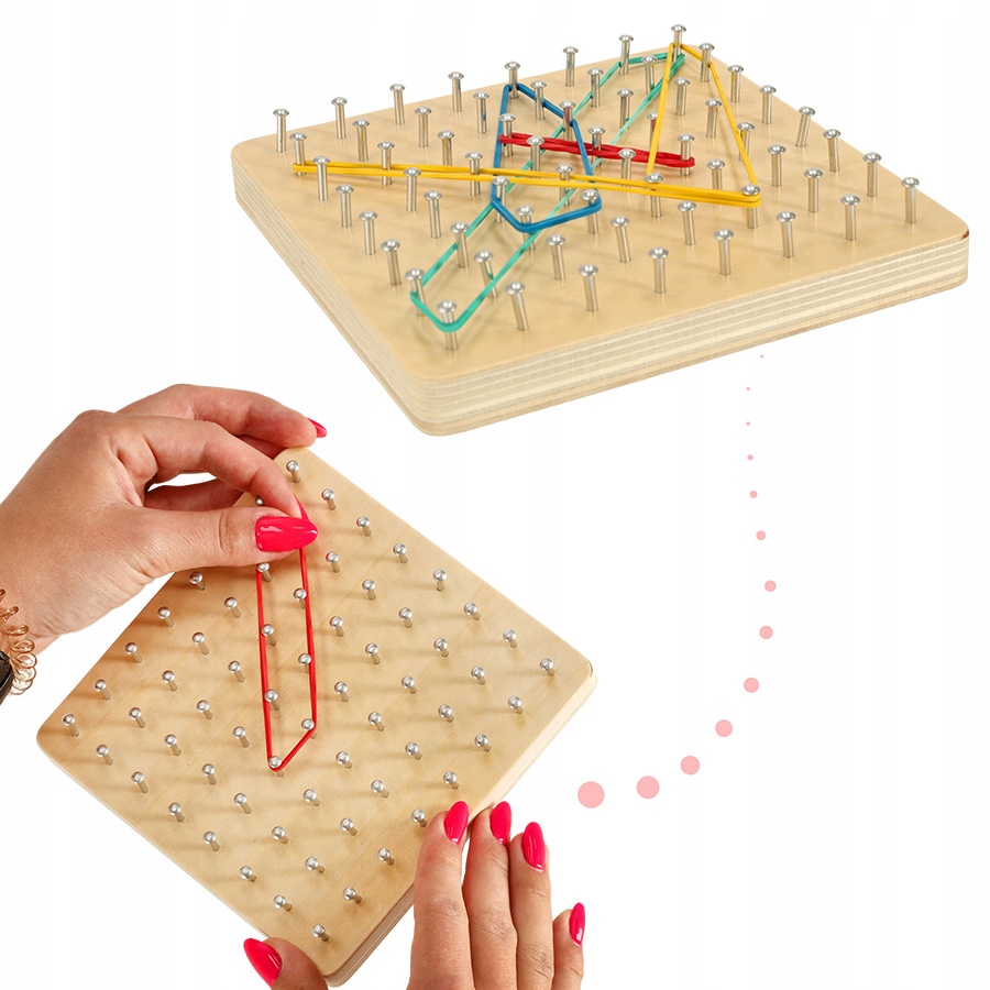 Геоборд — это деревянная доска, в которую наполовину вбиты гвозди. которые используются для создания различных фигур с помощью резинок. Это должно служить знакомство с математическими основами, такими как знание форм или изучение симметрии и углов.
