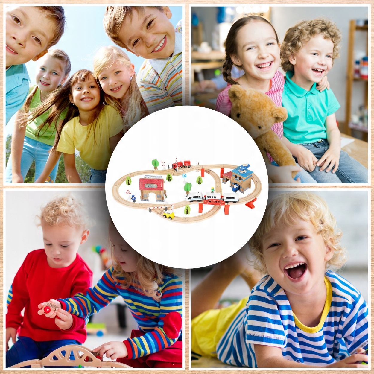 Дорожка изготовлена из деревянных элементов, что гарантирует высокую устойчивость к возможным повреждениям и более длительную эксплуатацию. Натуральный материал также означает, что поезд из него безопасен для здоровья ребенка.