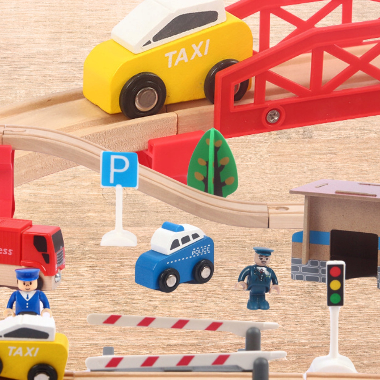 Набор состоит из 88 аккуратно выполненных и красиво отделанных элементов, которые можно компоновать по своему усмотрению. В комплект входят, среди прочего, трасса, поезд, 2 автомобиля, полицейский вертолет с посадочной площадкой, грузовик с прицепом, фигурки, железнодорожная станция, здание полиции с гаражом, мост, железнодорожный переезд. со шлагбаумами, деревьями и дорожными знаками.