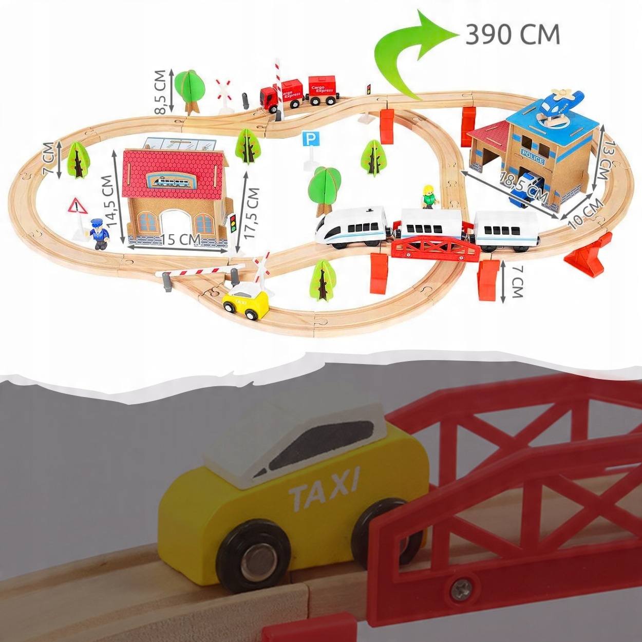 - СПЕЦИФИКАЦИЯ – материал: дерево; блок питания поезда: 1x АА (не входит в комплект); количество элементов в наборе: 88; ширина дорожки: 4 см; размеры в разложенном виде: 14,5х90х50см; вес с упаковкой: 2,27 кг.