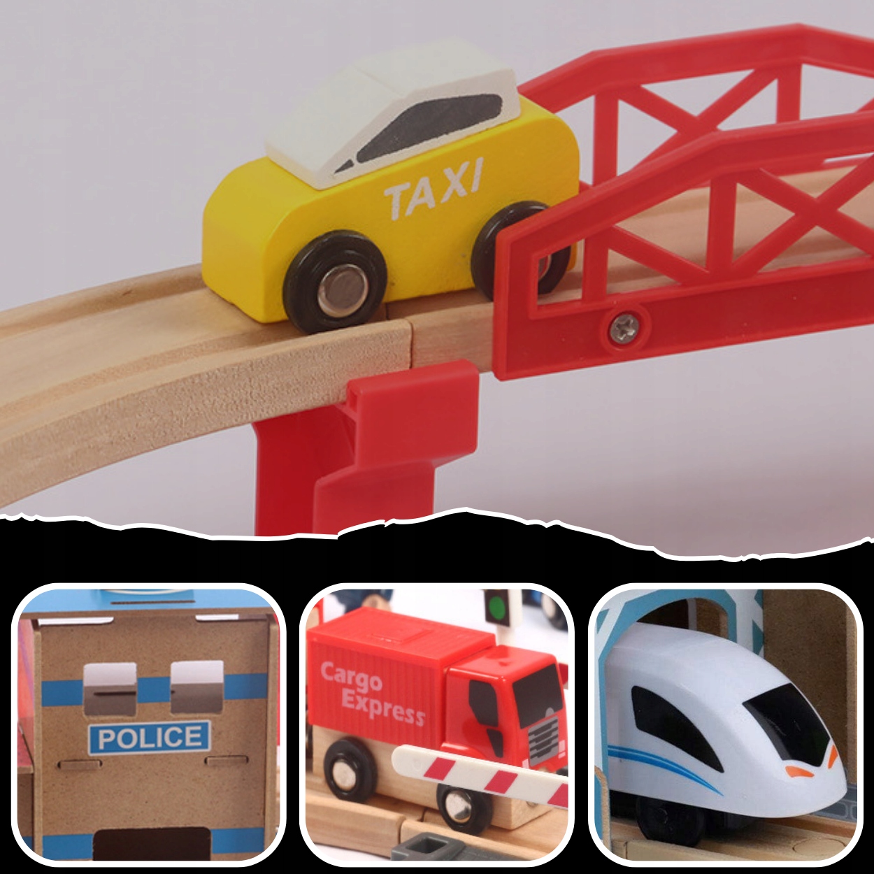 - 88 ЭЛЕМЕНТОВ - набор состоит из 89 аккуратно выполненных и красиво отделанных элементов, которые можно компоновать по своему усмотрению. б> . В комплект входят, среди прочего, трасса, поезд, 2 автомобиля, полицейский вертолет с посадочной площадкой, грузовик с прицепом, фигурки, железнодорожная станция, здание полиции с гаражом, мост, железнодорожный переезд. с барьерами, деревьями и дорожными знаками. Поезд и грузовик с прицепом соединяются с помощью магнитов, в них нет ненужных крючков, которые могут оторваться и вызвать постоянные проблемы у ребенка при отсоединении комплекта. Магниты сильные - не отпускают, даже когда весь комплект поднят.