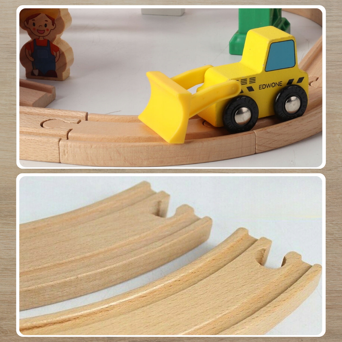 Дорожка изготовлена из деревянных элементов, что гарантирует высокую устойчивость к возможным повреждениям и более длительную эксплуатацию. Натуральный материал также означает, что поезд из него безопасен для здоровья ребенка.