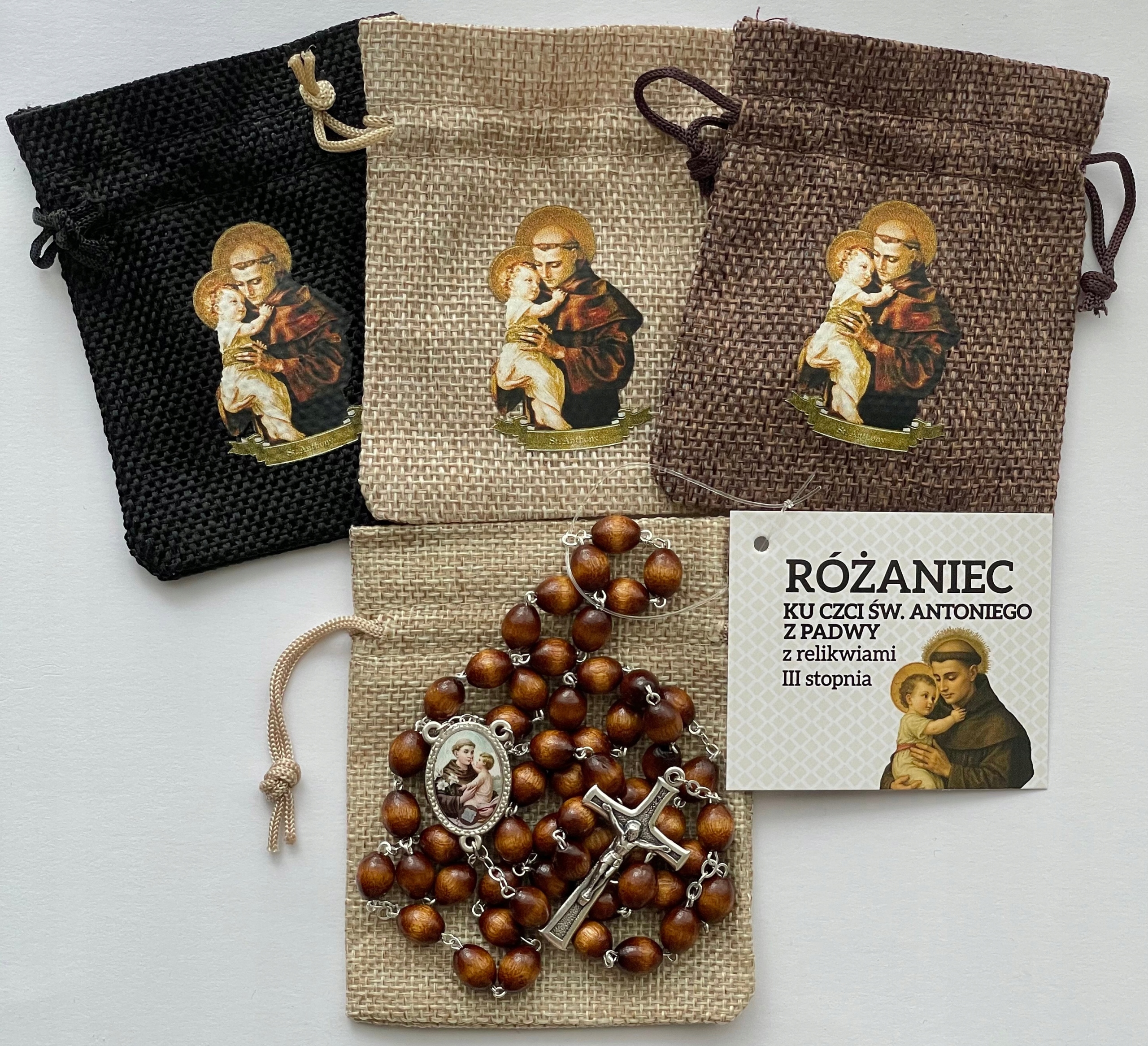 Деревянные четки(орех) с мощями святого Антонияс Падуейс прилагаемым сертификатом подлинности упакованы в джутовый мешочек с изображением святого. Энтони