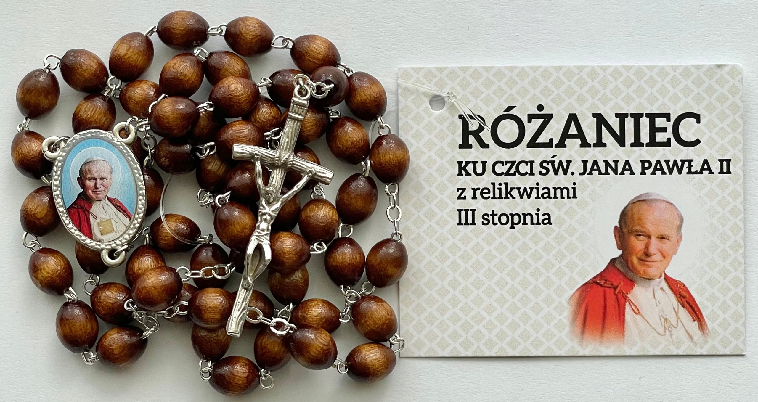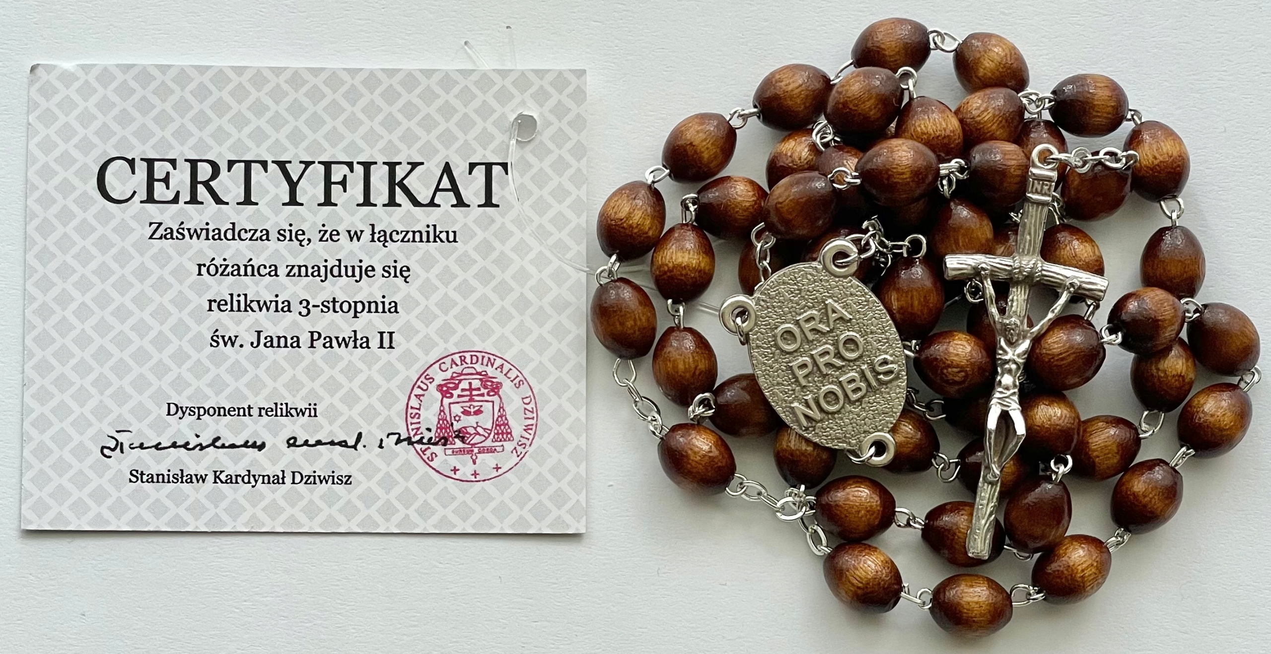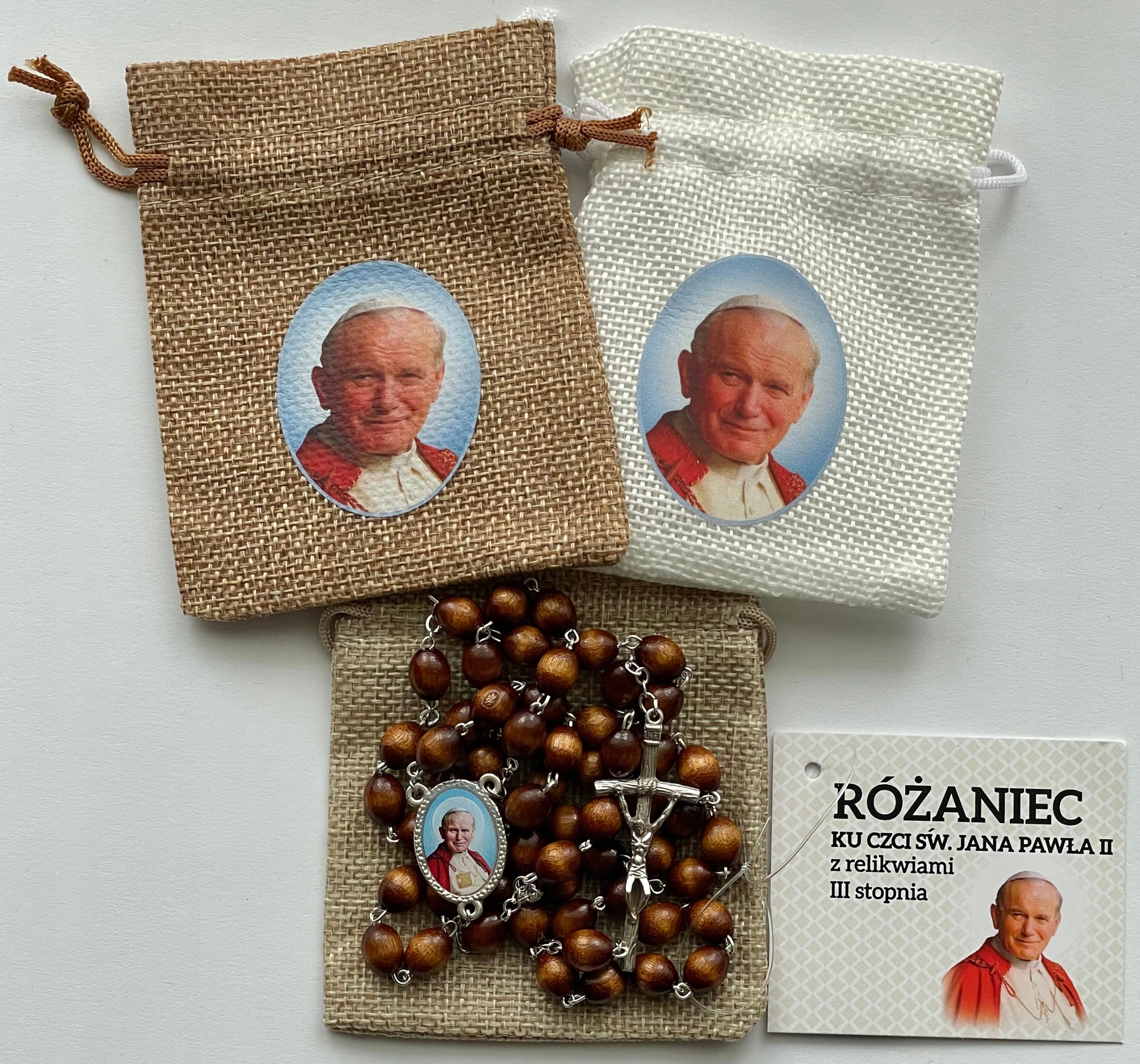 Деревянные четки(орех) с мощями святого Иоанна Павла IIсприлагаемым сертификатом подлинности упакованные в джутовый мешочек с изображением святого. Иоанн Павел II