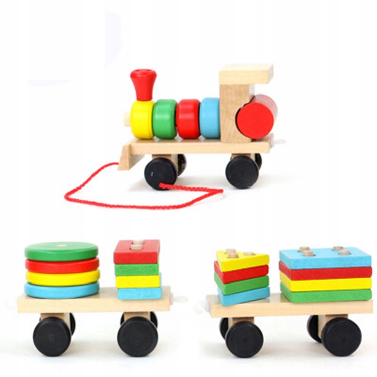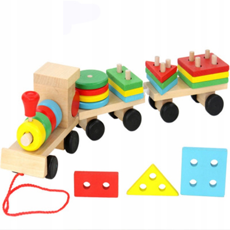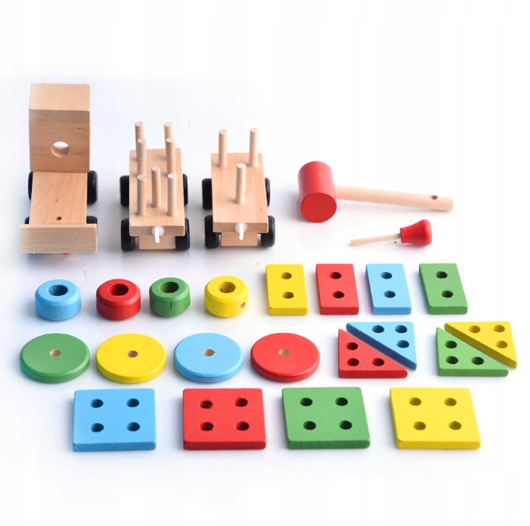 В комплект входит паровозик и 2 вагона. У каждой тележки есть выступающие штифты, на которые ребенок должен насадить кубик соответствующей формы.