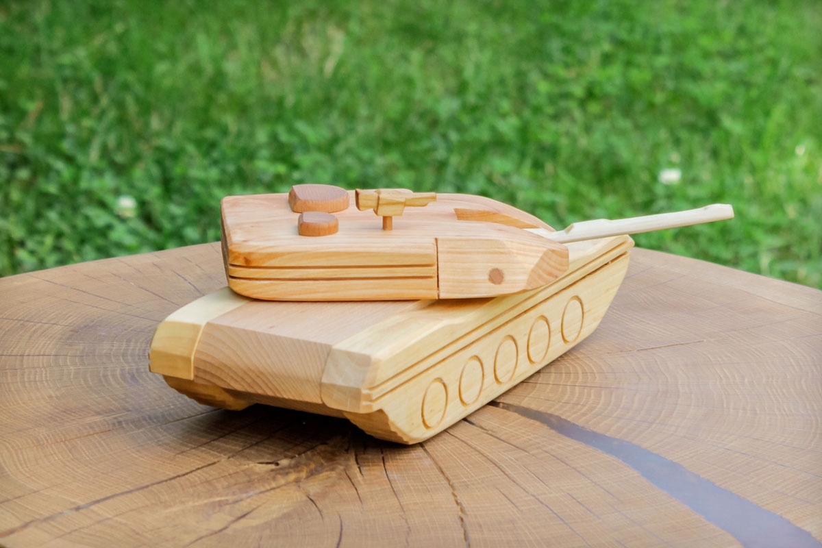 Танк сделан вручную из дерева – с большой точностью и вниманием к деталям. Игрушка стилизованная под американский танк "Абрамс".