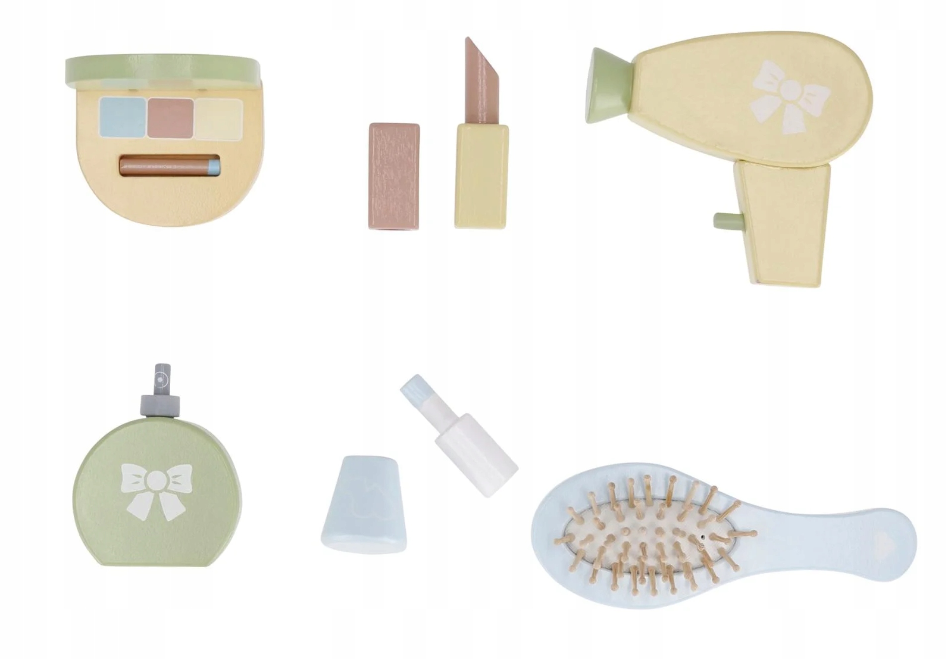 - набор деревянных аксессуаров: 1 лак для ногтей, 1 флакон духов с помпой, 1 помада, 1 тени с аппликатором, 1 расческа, 1 фен с кнопкой.